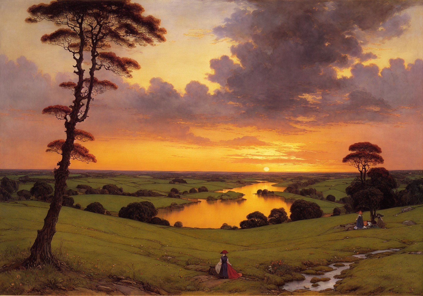 Prompt: Oil on canvas, wide angle landscape view, a wonderful sunset. Glowing with vibrant hues, glowing with vibrant hues, sky transitioning from warm orange to deep purple. Perfect composition. By Arthur Rackham. By William Turner.
