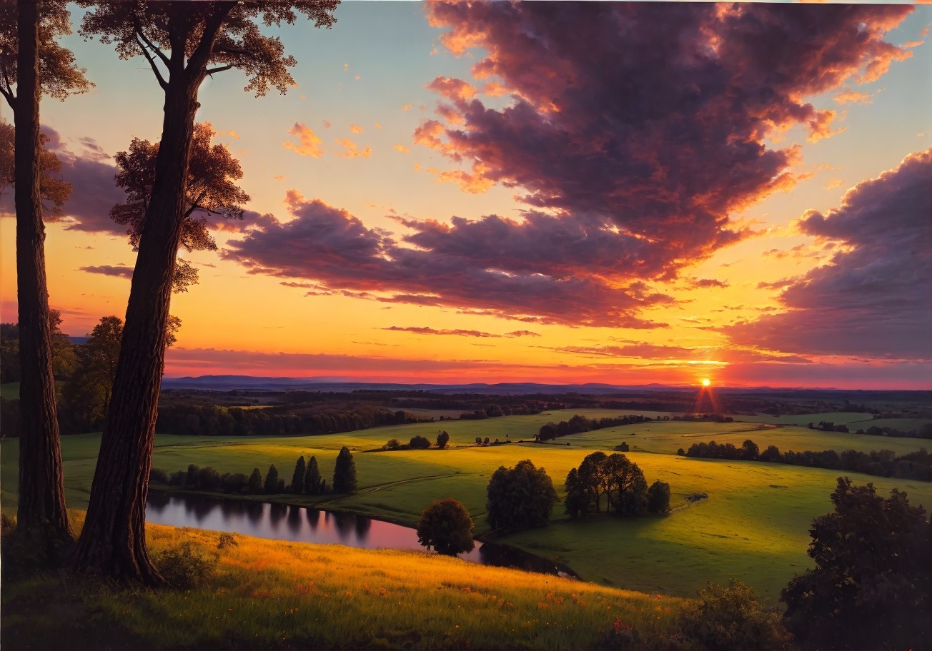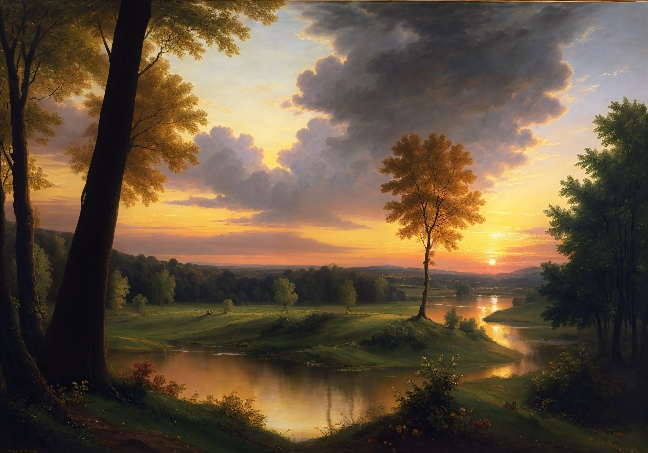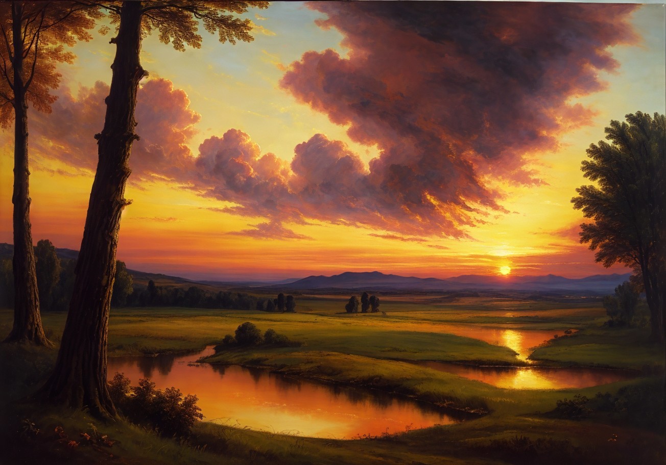 Prompt: "Oil on canvas, wide angle landscape view, a wonderful sunset. Glowing with vibrant hues, glowing with vibrant hues, sky transitioning from warm orange to deep purple. Perfect composition. By Peter Paul Rubens. William Turner. By Pierre-Auguste Cot."