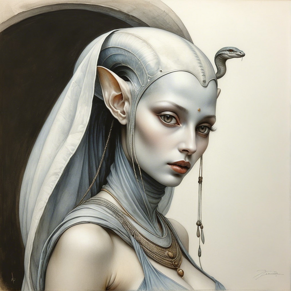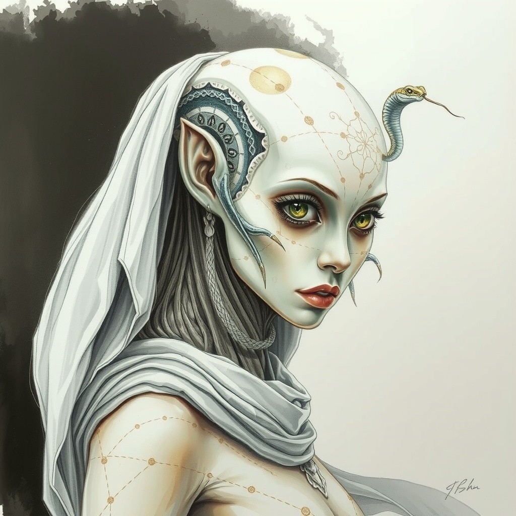 An ethereal woman with pale skin and a snake in her hand stands elegantly, adorned with gold and draped in white.
