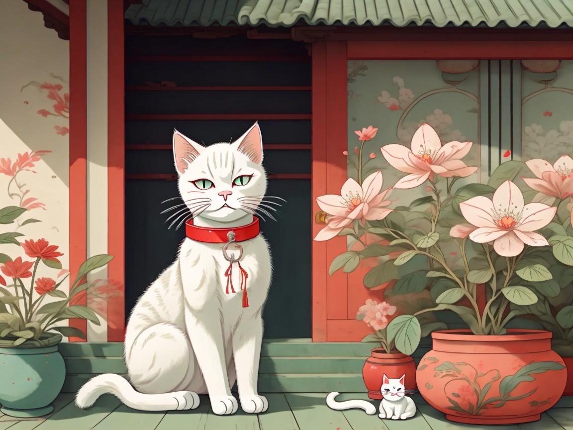Prompt: A white cat with a red collar sits proudly in front of a traditional Asian-style house, surrounded by vibrant flowers in pots. The background features delicate illustrations of plants and blossoms, creating a serene and enchanting atmosphere. The cat has a confident expression, adding a whimsical charm to the scene.
