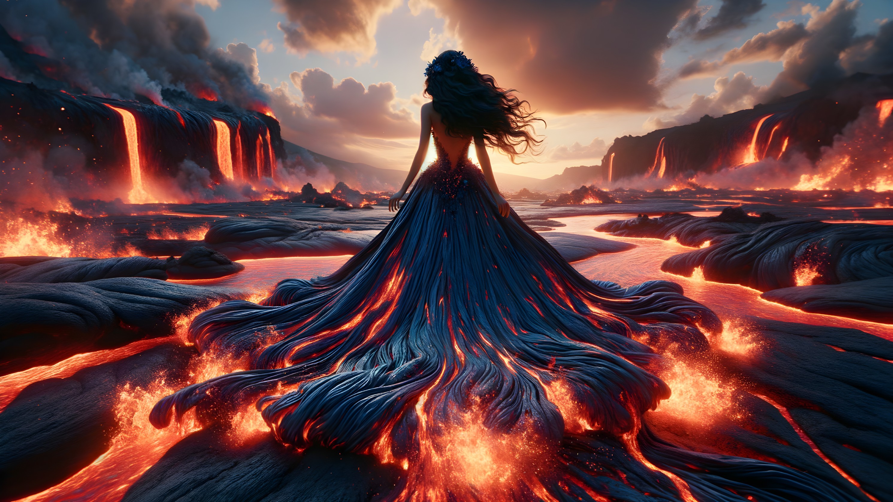 A silhouette of a woman in a flowing dress stands before a breathtaking volcanic landscape, with flowing lava and cascading waterfalls under a dramatic sunset sky.