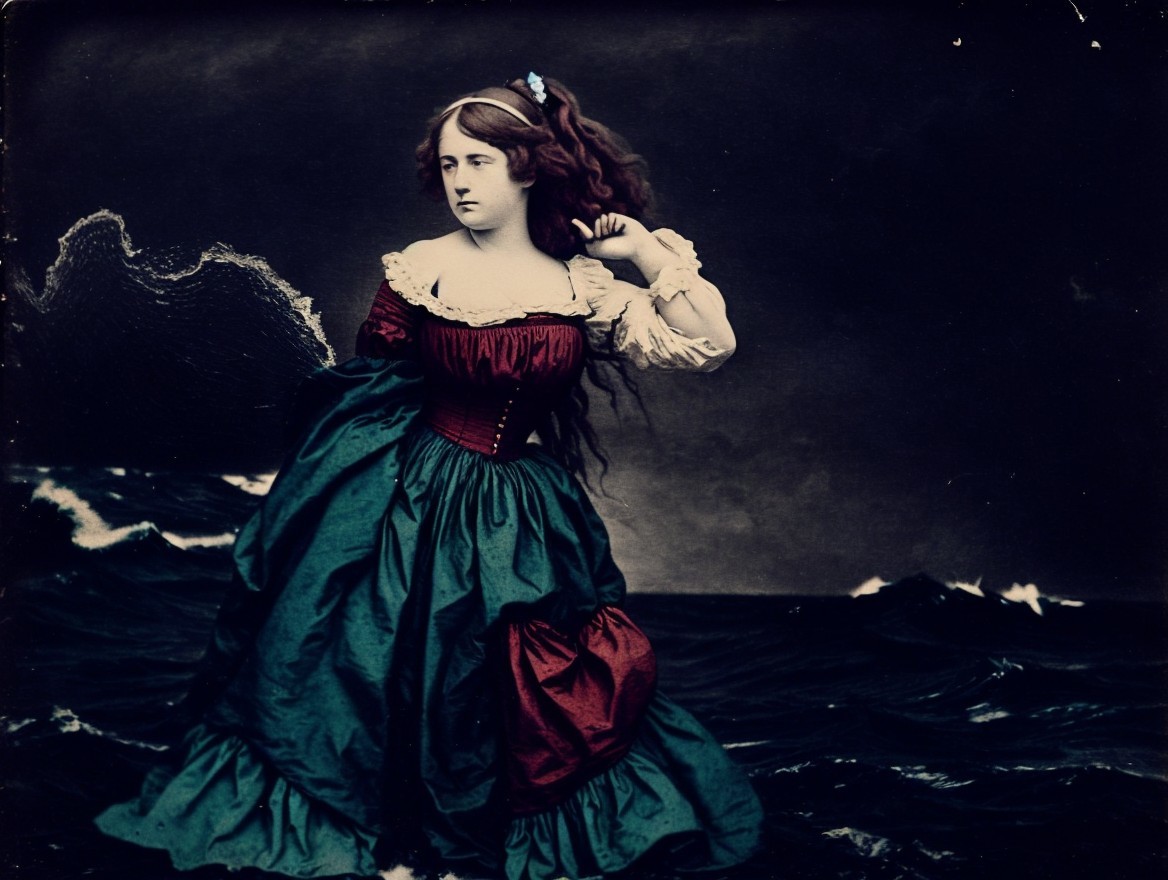 A vintage tinted photo of a woman in a red and green dress standing with a hand on her hair against a painted ocean backdrop.