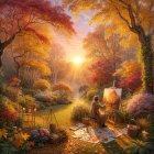 A tranquil garden at sunset, adorned with vibrant flowers and lush greenery. A wooden easel and chair sit invitingly amidst the blooms, bathed in warm, golden light.