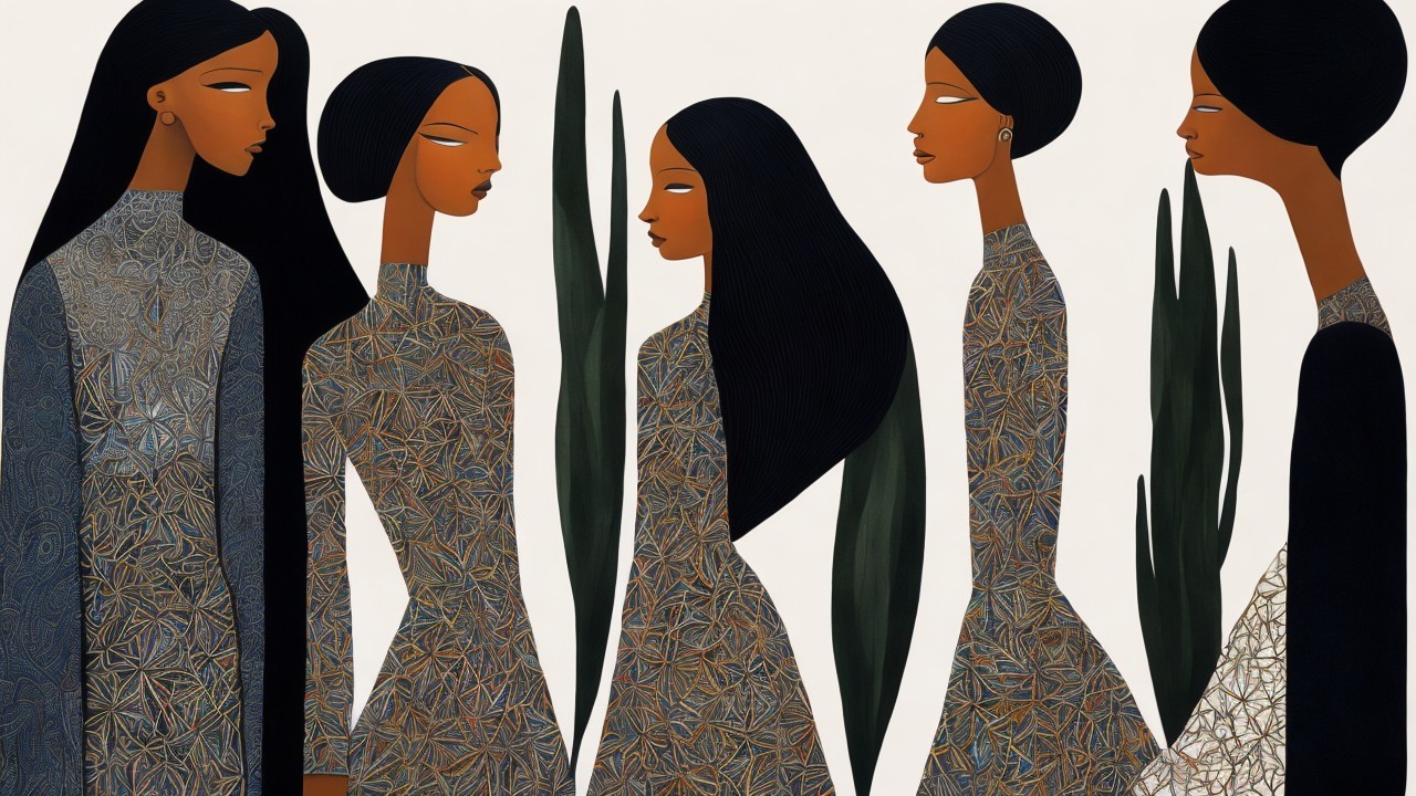 The image features four stylized figures of women, all dressed in elegant, patterned dresses. Their long hair flows gracefully, and they have distinctive facial features, exuding a serene, artistic vibe.