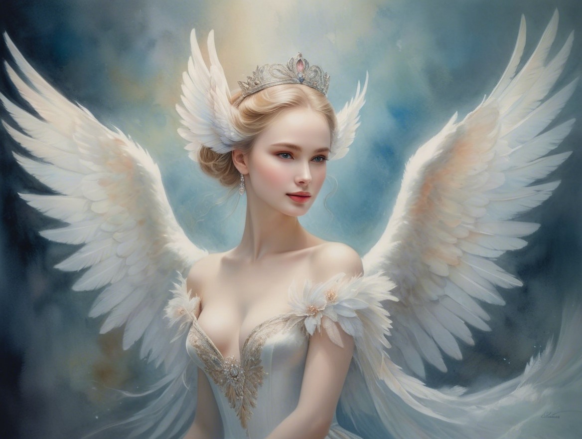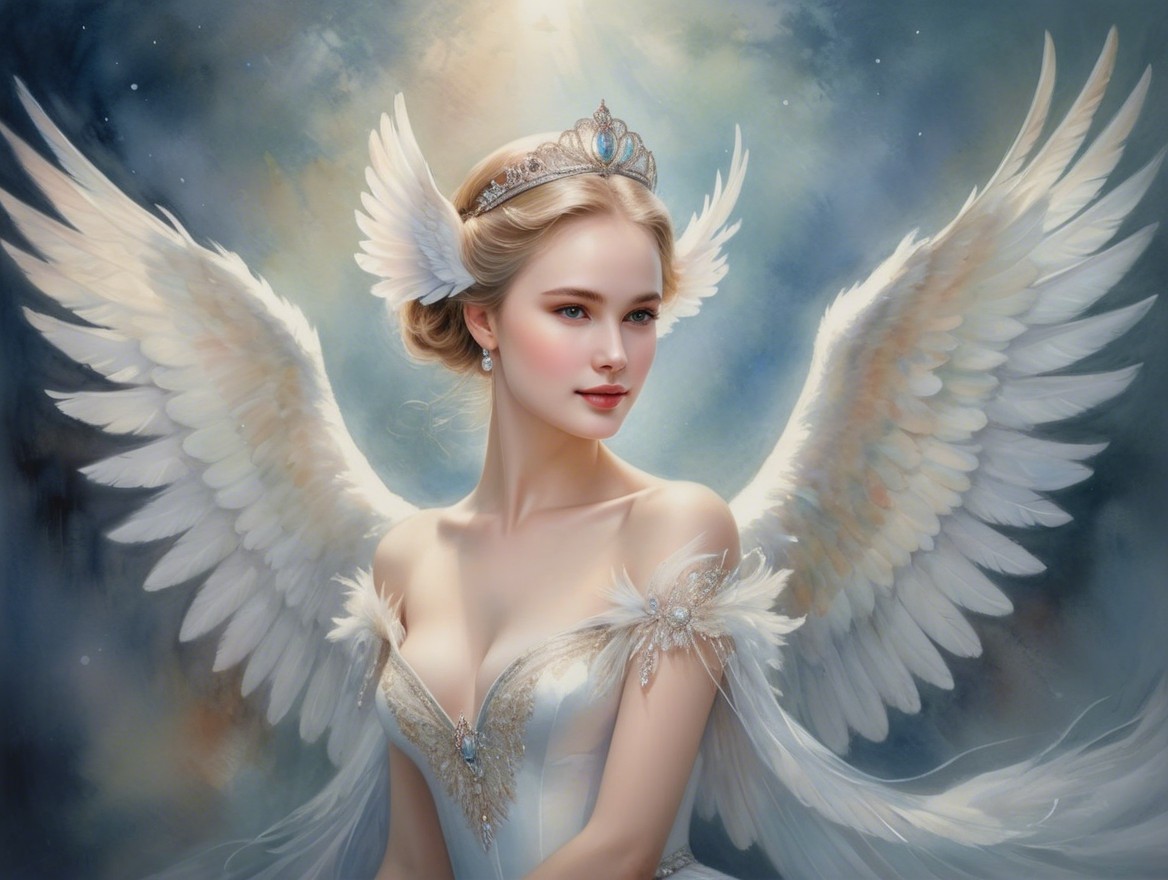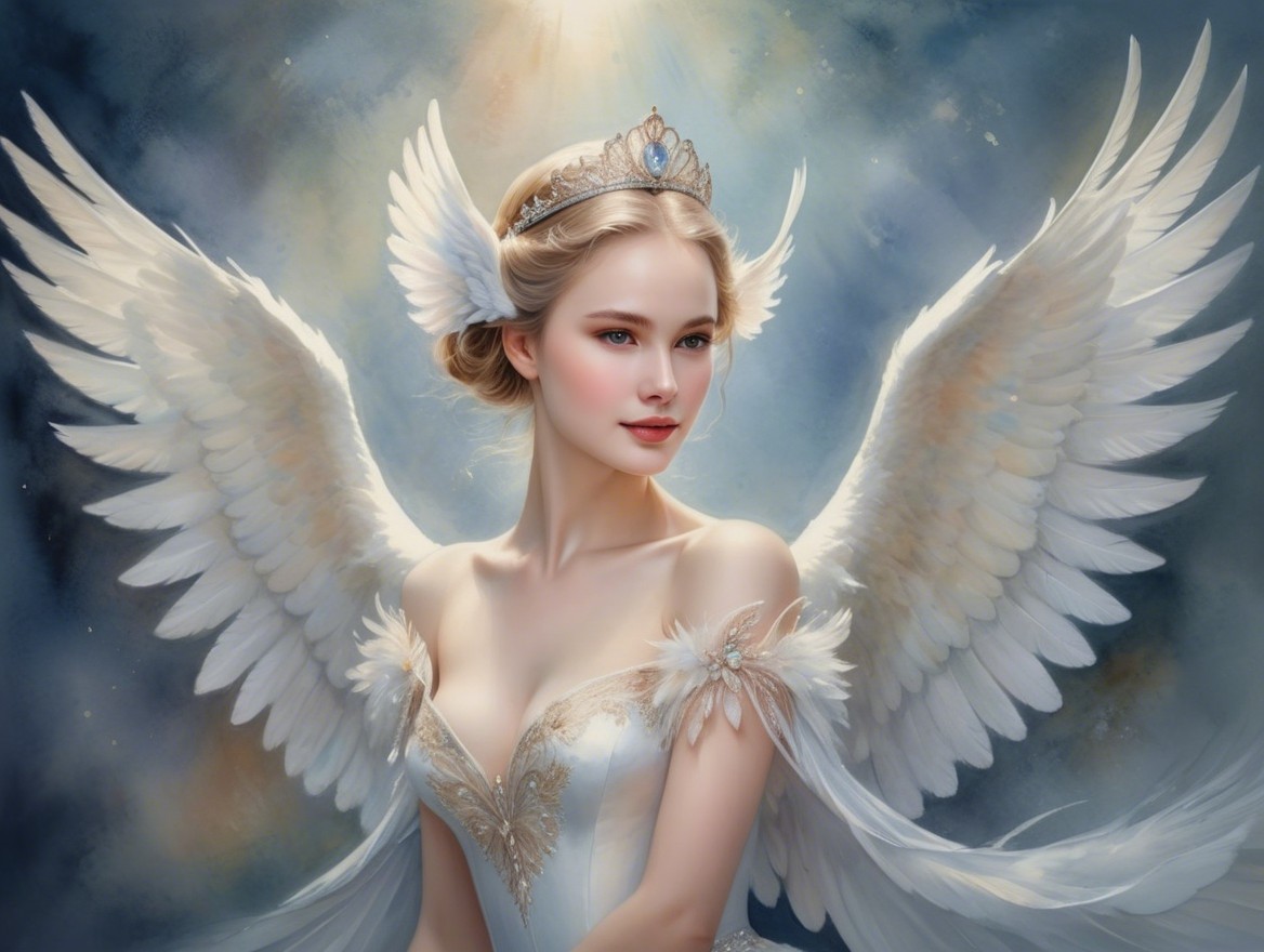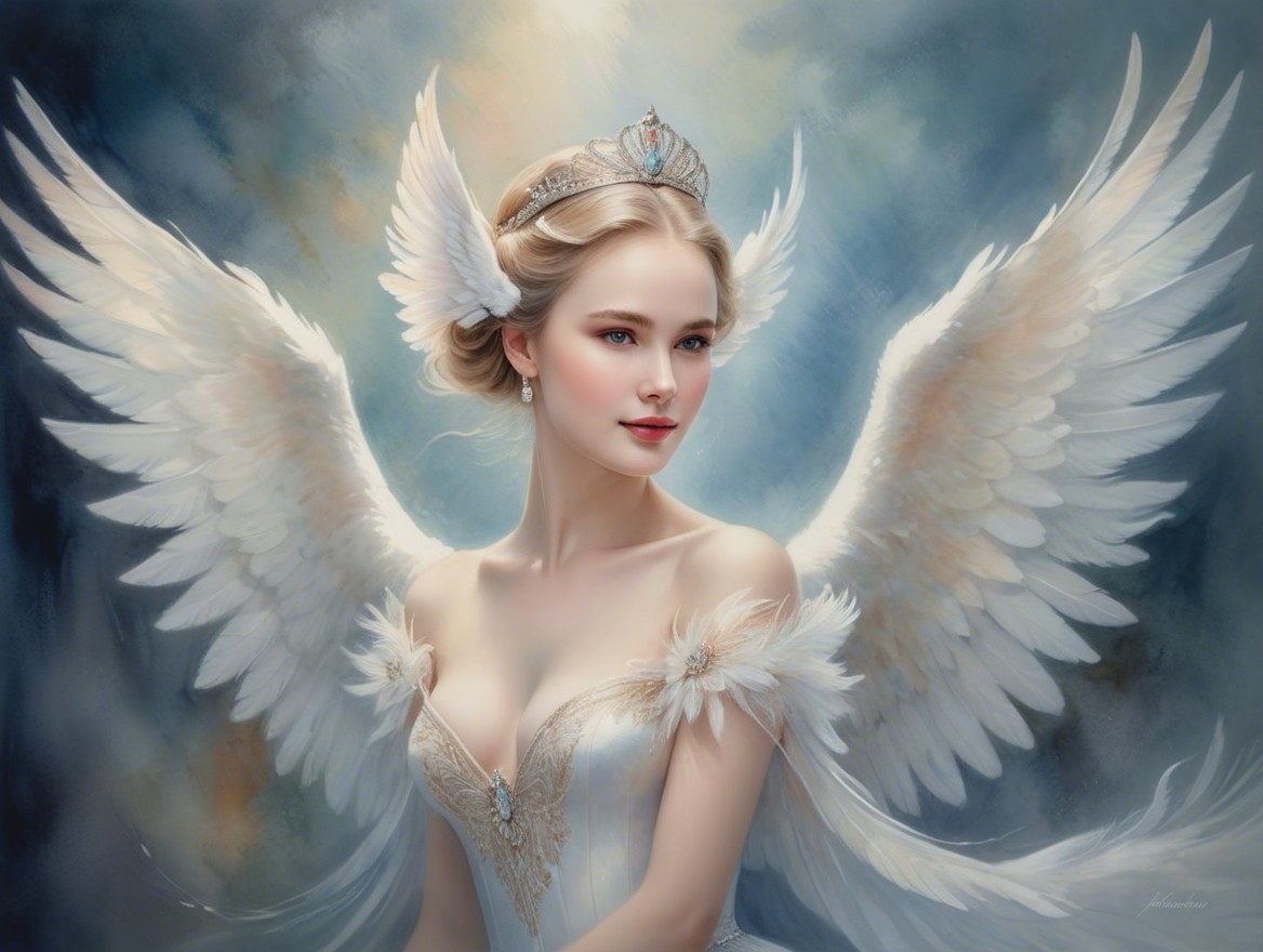 A serene figure with angelic wings and a jeweled crown. She radiates grace and beauty, clad in an elegant gown, bathed in soft, ethereal light that enhances her ethereal presence.