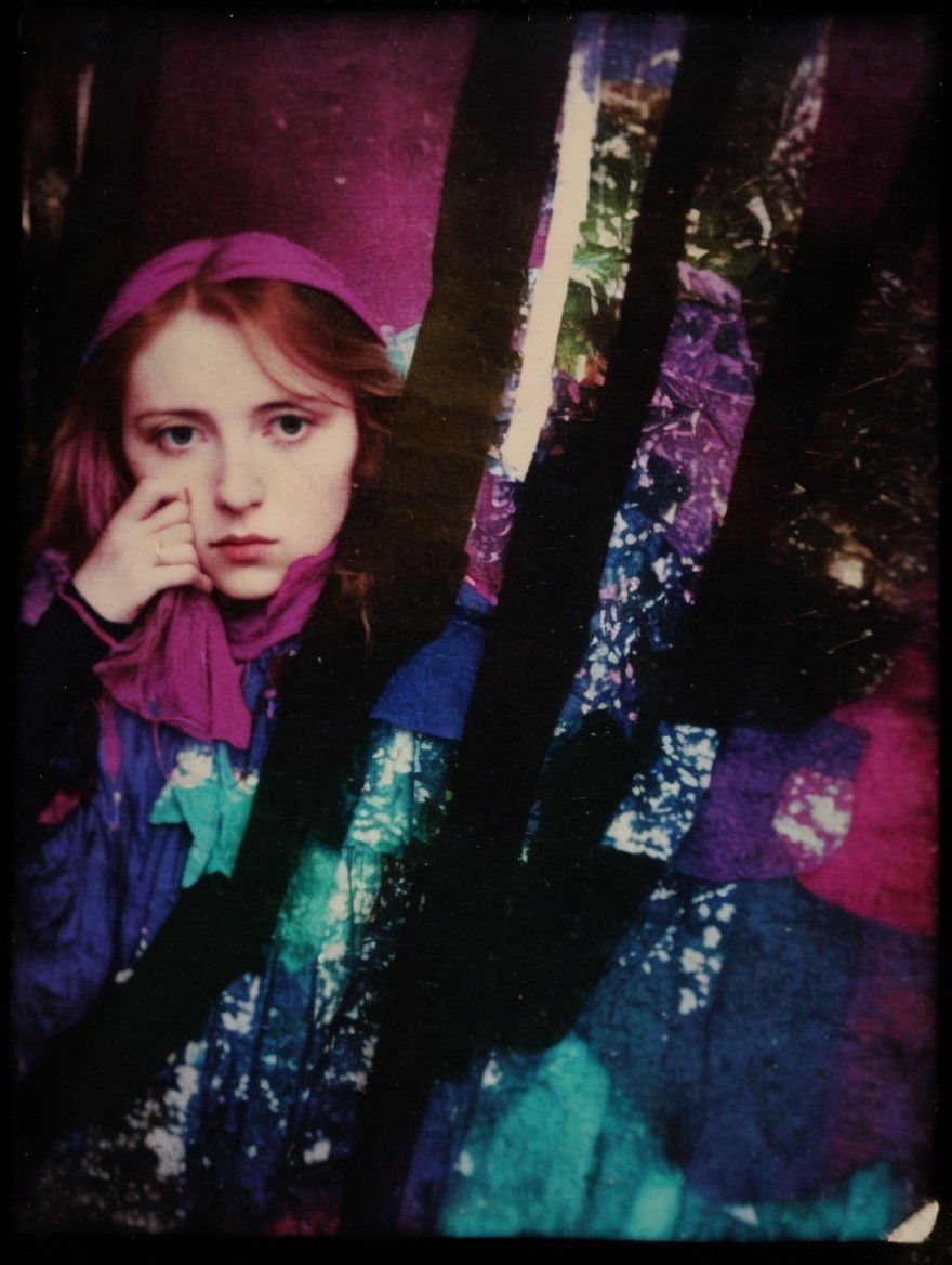 A contemplative young woman with wavy red hair gazes thoughtfully while surrounded by abstract, layered visuals. The colors blend and reflect, creating a dreamy, artistic atmosphere.
