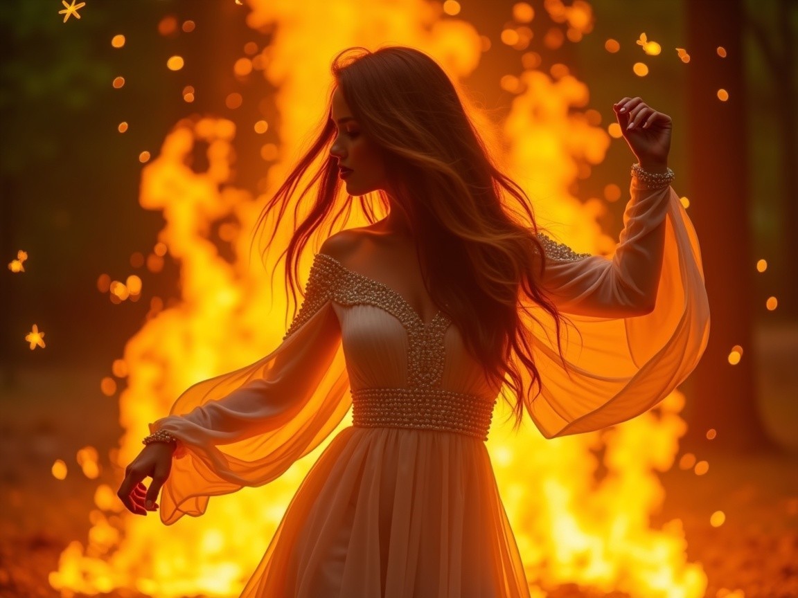 A dancer in a flowing golden dress twirls gracefully amidst a dazzling display of fire and sparks, surrounded by a captivated crowd against a vibrant, dramatic backdrop.