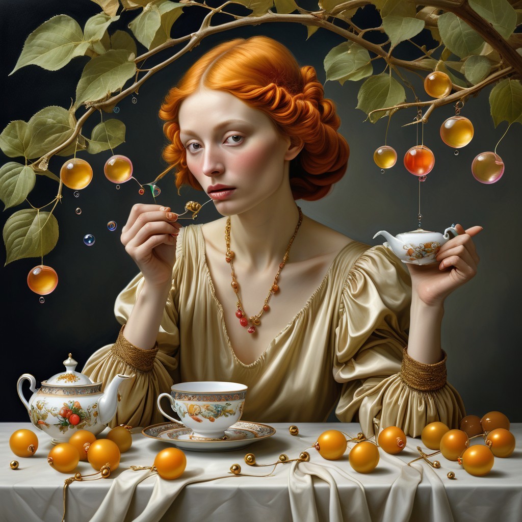 A woman with vibrant orange hair sits at a lavish tea table adorned with fruit. She holds a teapot and a colorful pearl, surrounded by decorative golden fruits and bubbles.