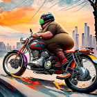 A surreal image of a humanoid figure with textured skin riding a vintage motorcycle, set against a barren landscape and a large orange sun, evoking a sense of solitude and reflection.