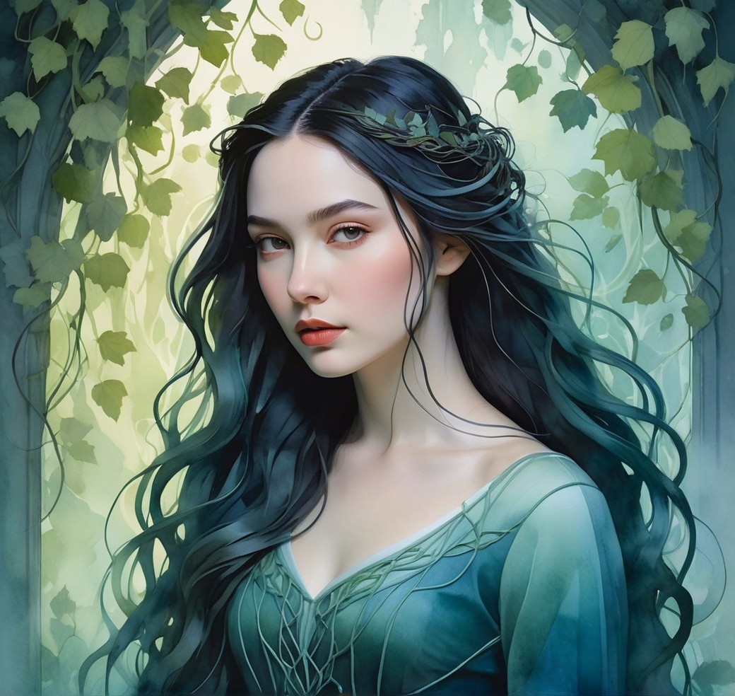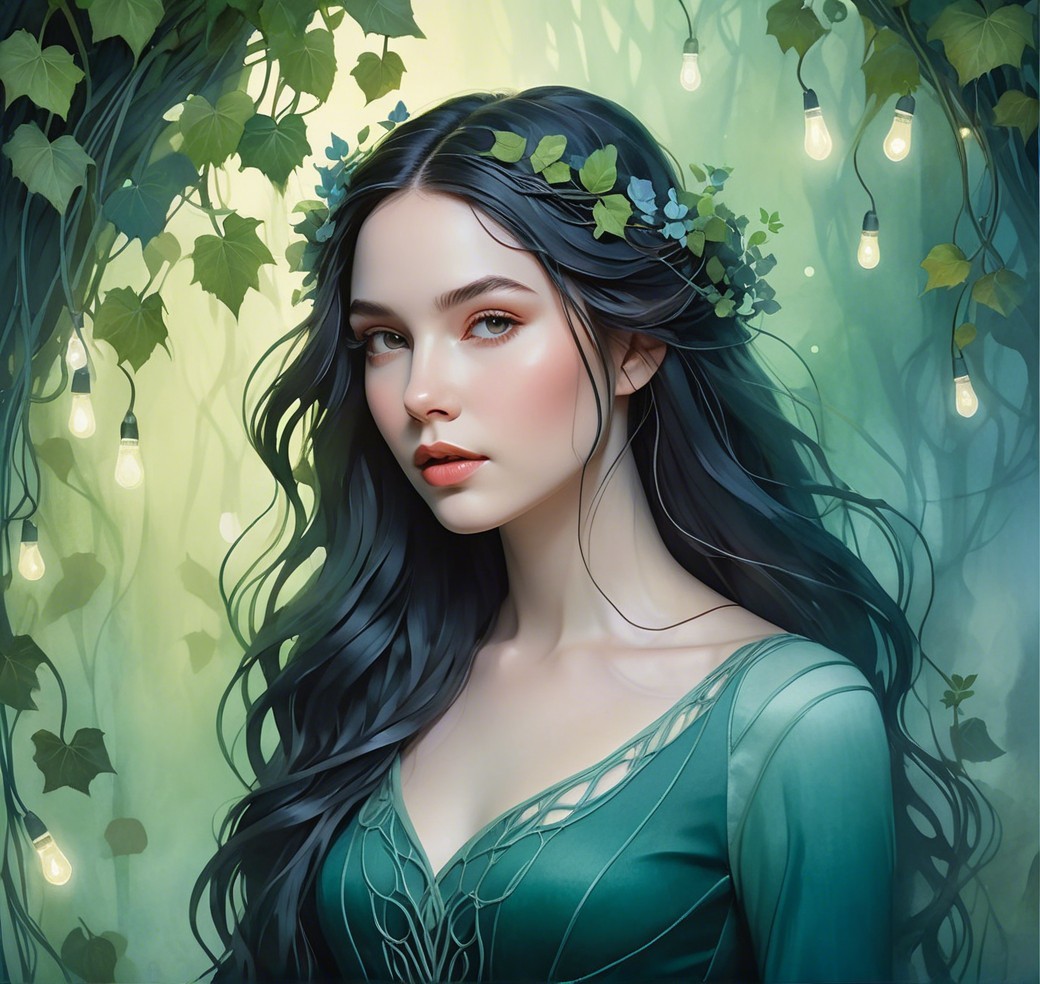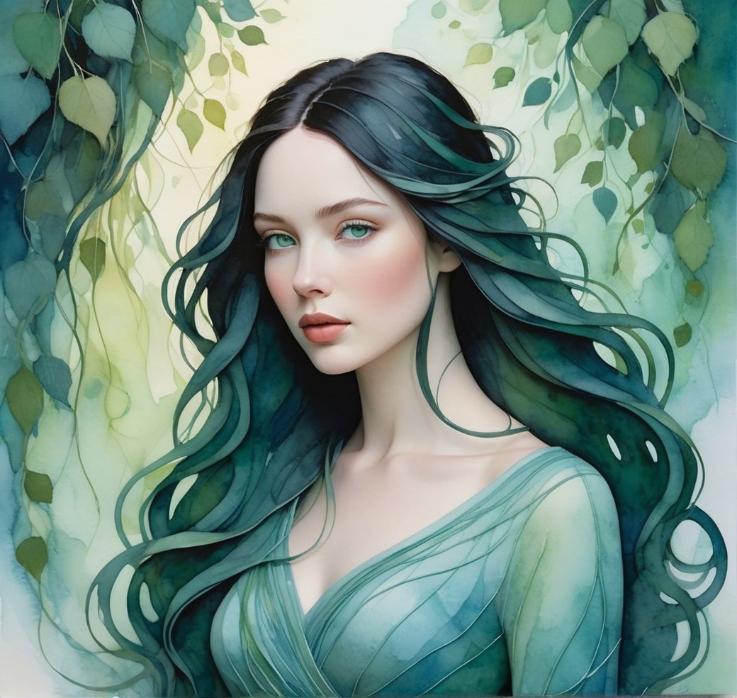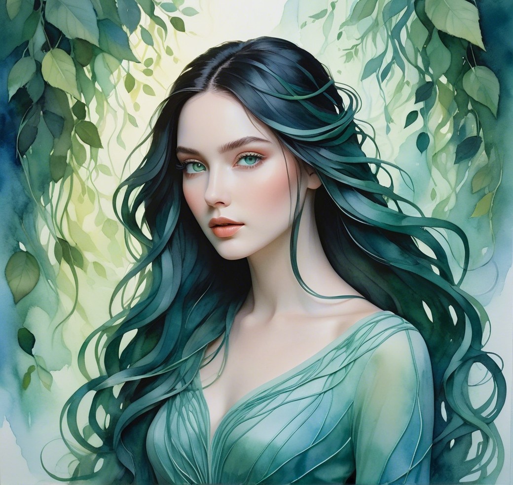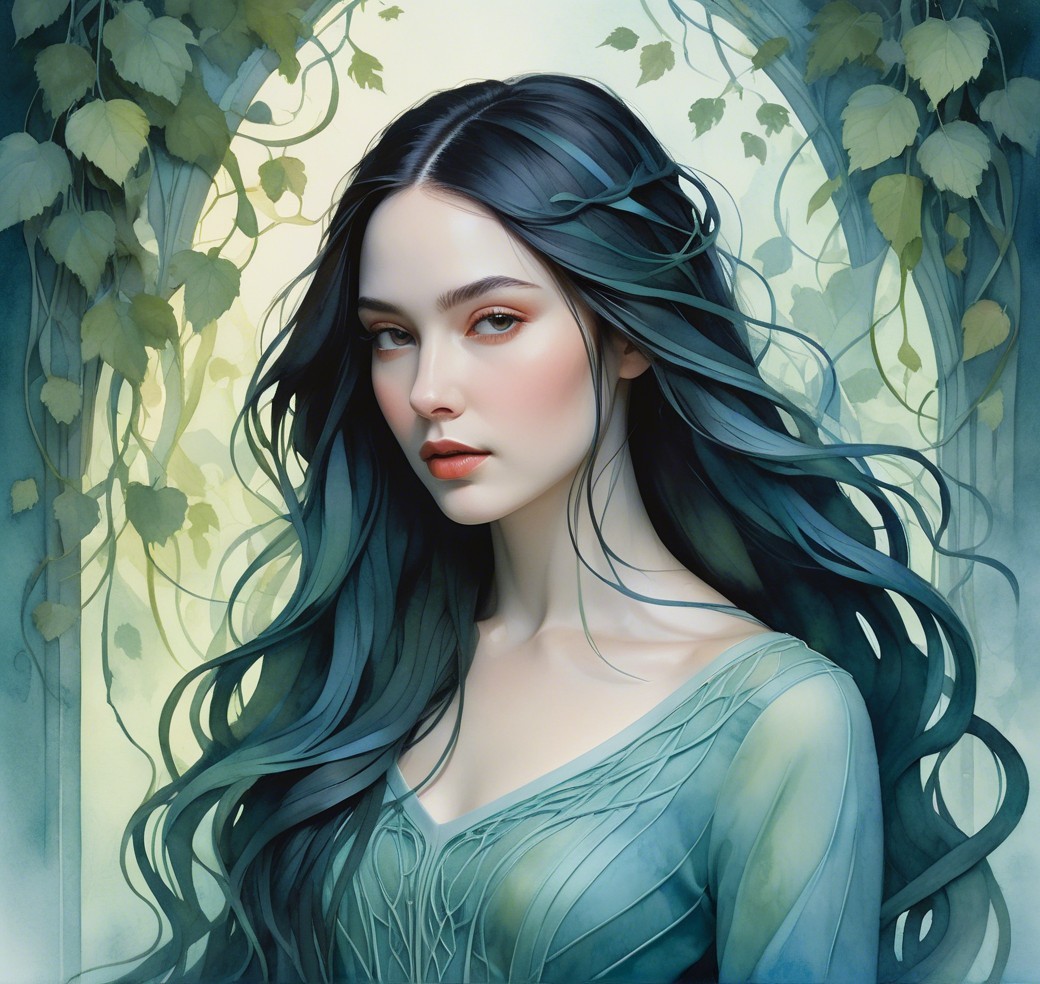 + Prompt:Stylized 3d portrait, porcelain skin, flowing dark hair, form-fitting garment intertwined with vines, 3d effects,floating lights, and misty green-blue hues. Art style inspired expressive illustration, linework, graceful, soft watercolor washes, vivid coloring, bold contrast, softened lighting, great depth and scale, american gothic 1.7, rim lighting, impossible light transitions, divisionism, gothic fetishism merged with art-nouveau style reminiscent of William Bradley, multilayer rendering for 128K HDR, avant-garde artwork, strikingly colorful, brightness 1.3, zentangle, plasticity 1.1, emulsion shifts, dyed, trippy, warm toned ethereal glow, reminiscent of comic book art, vibrant, magical atmosphere, linocut contourings, surreal, dreamlike setting, intricate linework, detailed linocut textures, collagraphy elements, stylized with micro-pen lines, warm and rich color palette with earthy tones, layered textures, fragmented elements, sculpted ensuring perfect symmetry and intricate visual cohorence, luminism, plasticity 1.6, dynamic lighting effects. Magical realism, merged styles of ho baron and man ray and John buscema & Anna Dittmann & Alphonse Mucha, lighting in Gerald Brom's style, restrained lighting. dreamlike textures, vivid and glowing, created with watercolors and pastels, painterly style with heavy brushstrokes by Brandon Mably, dyed, subsurface scattering 1.3, parallax occlusion 1.3, raytraced shadows 1.3, harmonious, quilling, unity with nature, mystical, hand-drawn illustration style, irregular strokes, blotting,
