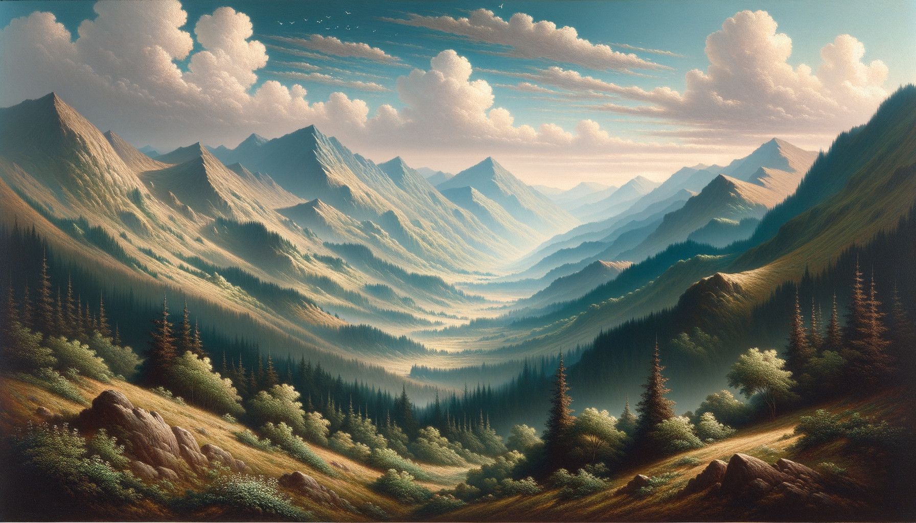 A serene valley with cozy cottages amidst vibrant forests and majestic mountains under a dramatic, cloud-streaked sky at sunrise or sunset.