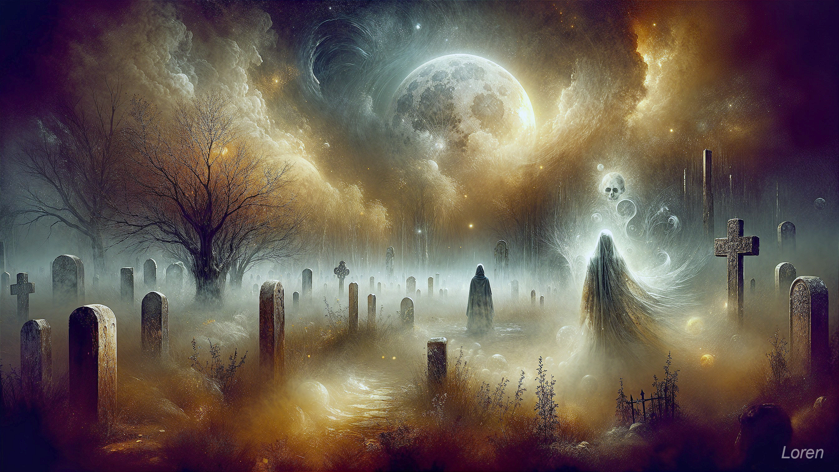 A haunting graveyard scene shrouded in mist, with eerie glowing spirits among tombstones. A large moon illuminates the dark sky, enhancing the mystical and ghostly atmosphere.