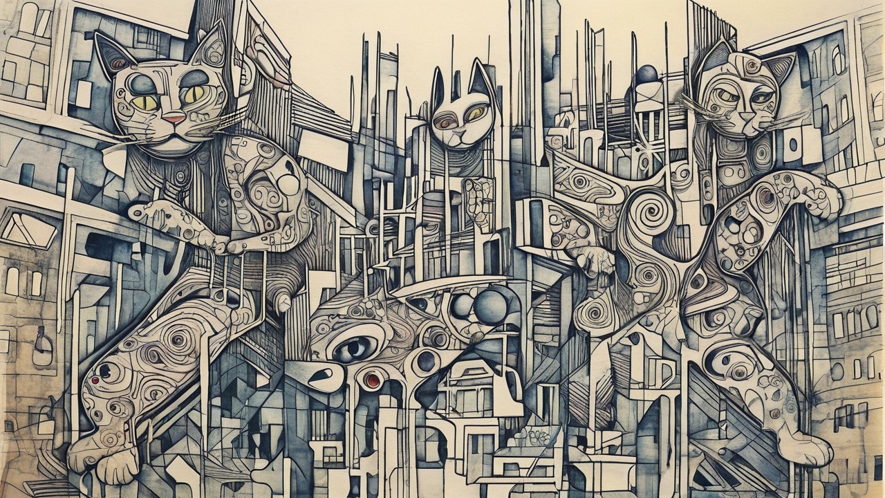 Prompt: "[[_{Literally cat body and face contours glitched infusion shapes architectural sketch, gemini entity Cat's mixed media artwork abstract/surreal Insane in the Membrane by: Jean Dubuffet's style into chimeric mix of style by (Seurat, Redon, Turner) by Gerald Scarfe's political satire Contamination in Beksinski's style}_{Occult chimeric eerie cyanotype MAP mixed in DeviL, inside drollery of a transparent latex glove RED macabre comically encaustic grotesquely whimsical naive with toxic yellow googly eyes and toxic red chattering teeth, Balenciaga mode show in Panic!, it will grow out of hell spawn and with all that anger against life. Elements of photorealism in a truncated hyper-surreal scene. Blended art style in one by: Molzahn, Hockney, Caulfield, Craig-Martin, Voynich, Luigi Serafini, dystopian bio horror feeling}_]]"