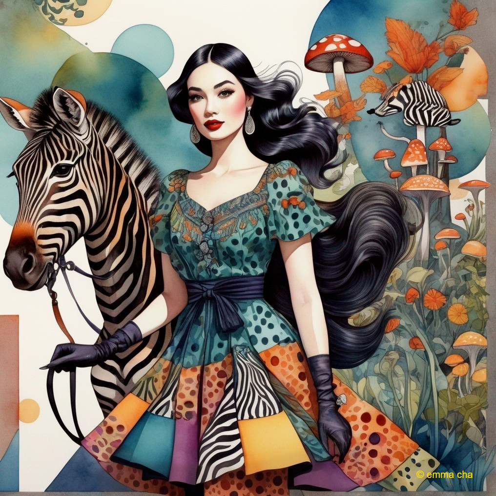 Artistic image of a stylized woman with a zebra and mushrooms, featuring vibrant colors and whimsical elements.