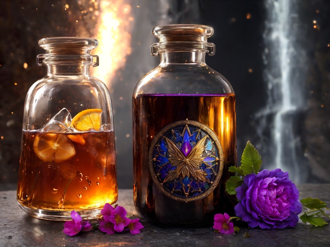 The image features two elegant glass pitchers filled with vibrant drinks, one with raspberries and the other with a purple hue, alongside a glass of ice. Sunlight glimmers through the bottles.