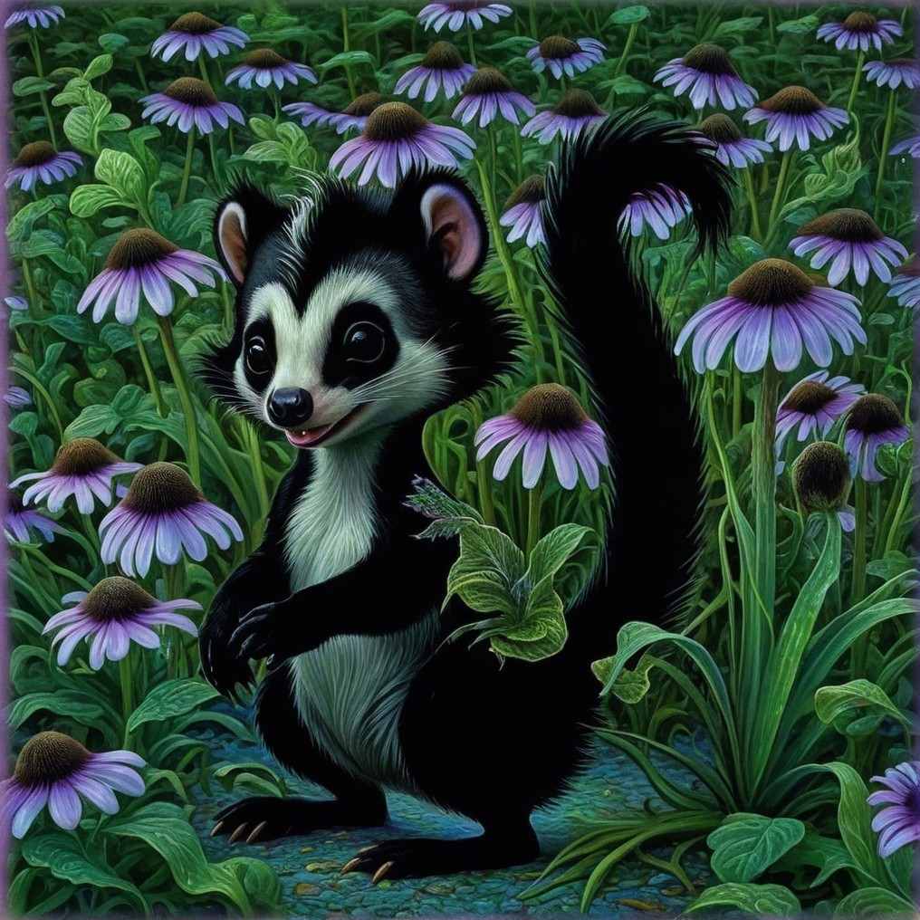 A cute, cartoonish black and white creature with large eyes and a fluffy tail sits amidst colorful flowers in a lush green meadow, exuding a playful and charming vibe.