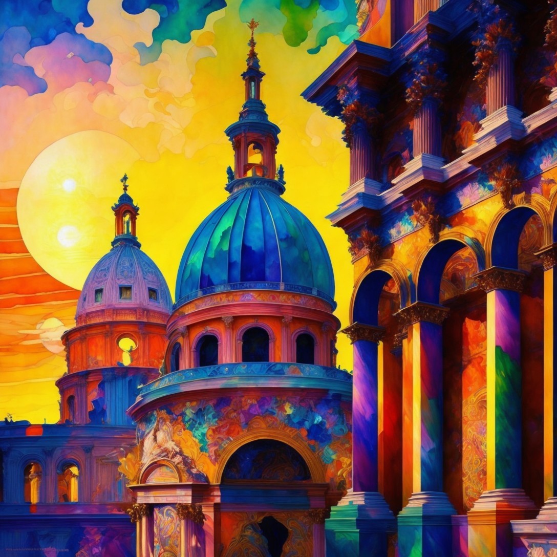 Prompt: 3D watercolor patchwork, high definition, spectacular sunrise over Rome, fantastic view, satiny, high quality, shimmering elegant style with vibrant saturated colors, elegant, highly detailed, glistening magic style, by Alphonse Mucha with elements of Gustav Klimt style, no frame, no border, no mat