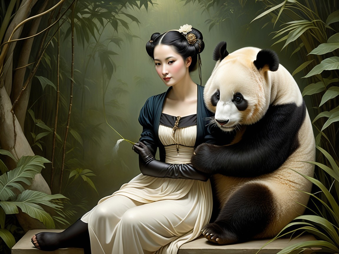 A serene scene featuring a woman in a flowing dress with an elegant hairstyle, holding a small object, next to a friendly panda amidst lush green bamboo.