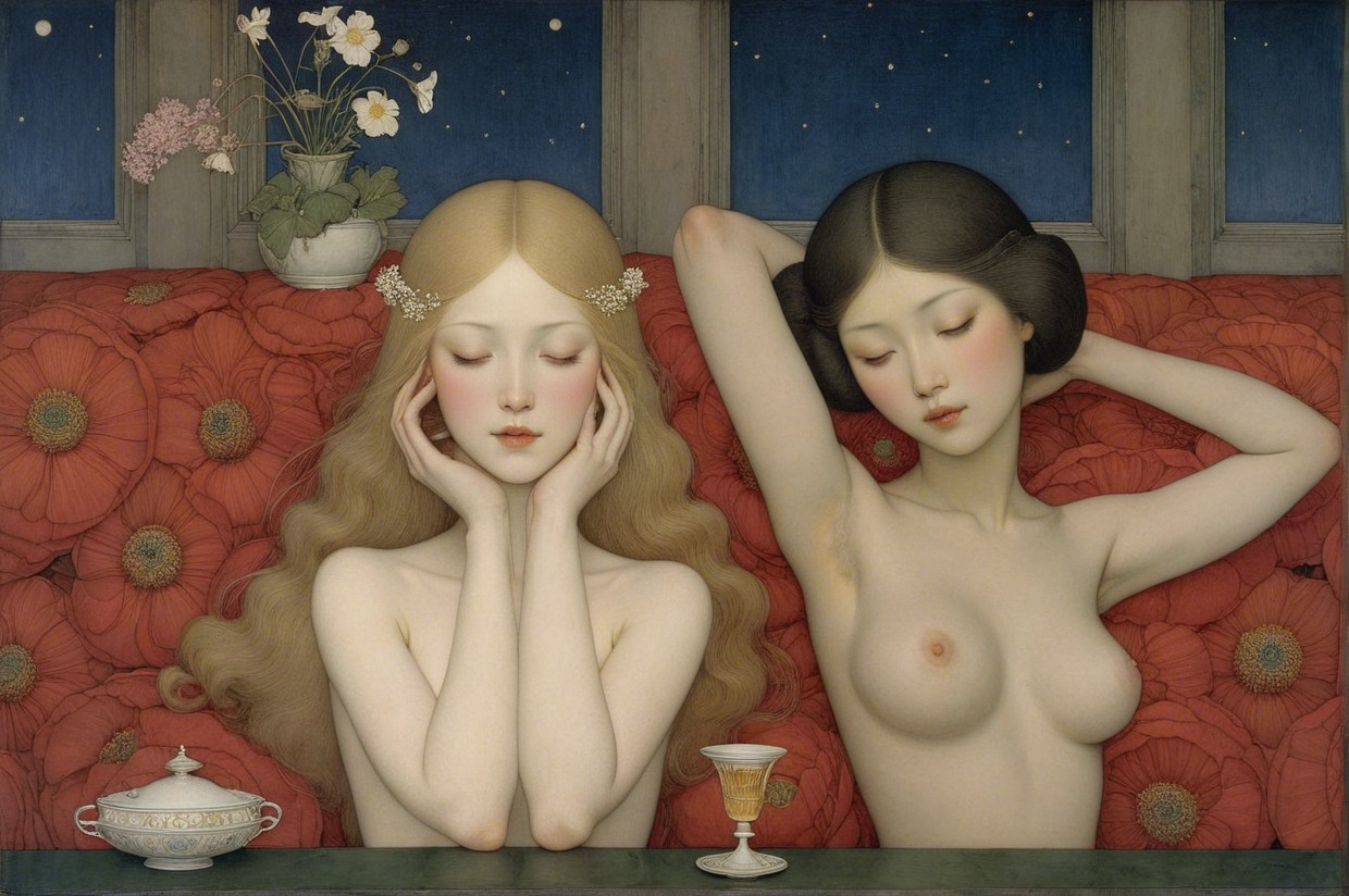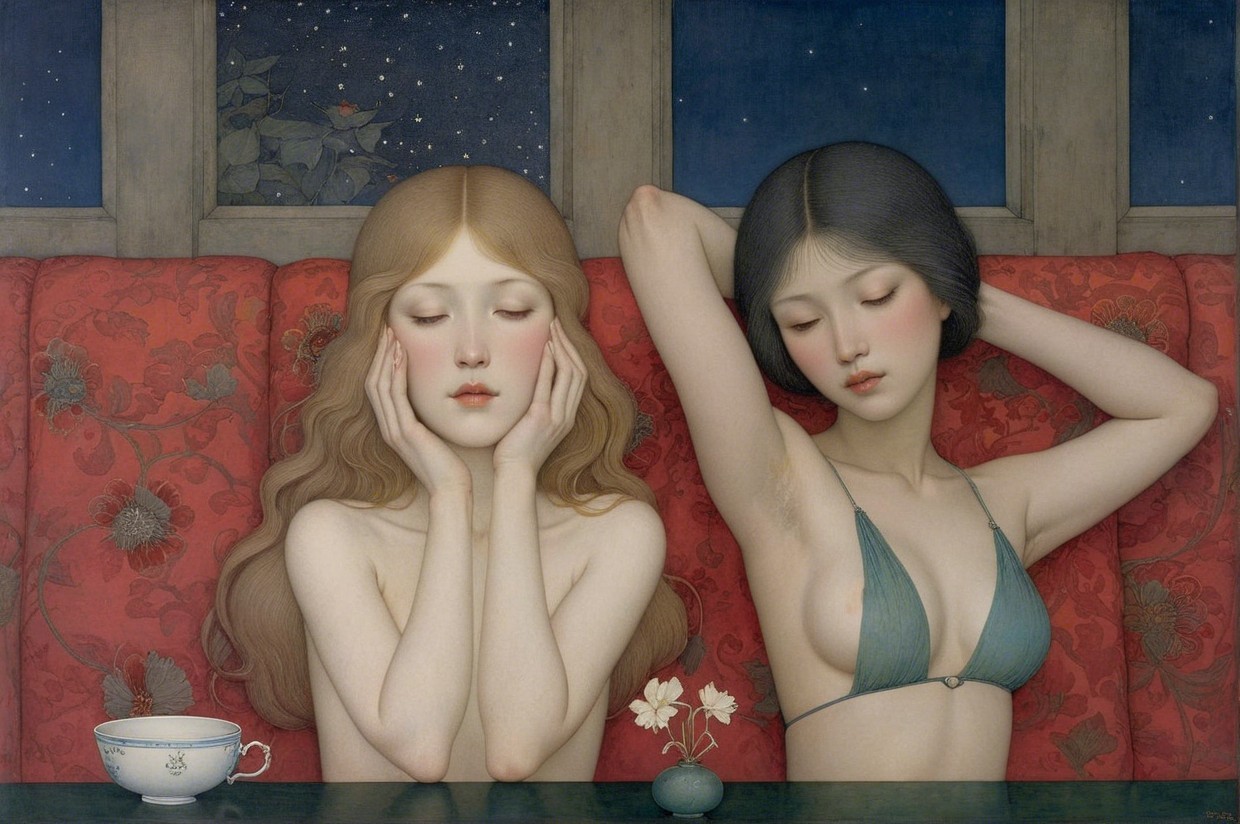 Two elegantly dressed women sit on a red couch, one with flowing blonde hair and the other with dark hair. Soft lighting from a candle highlights their serene expressions, set against a starry background.