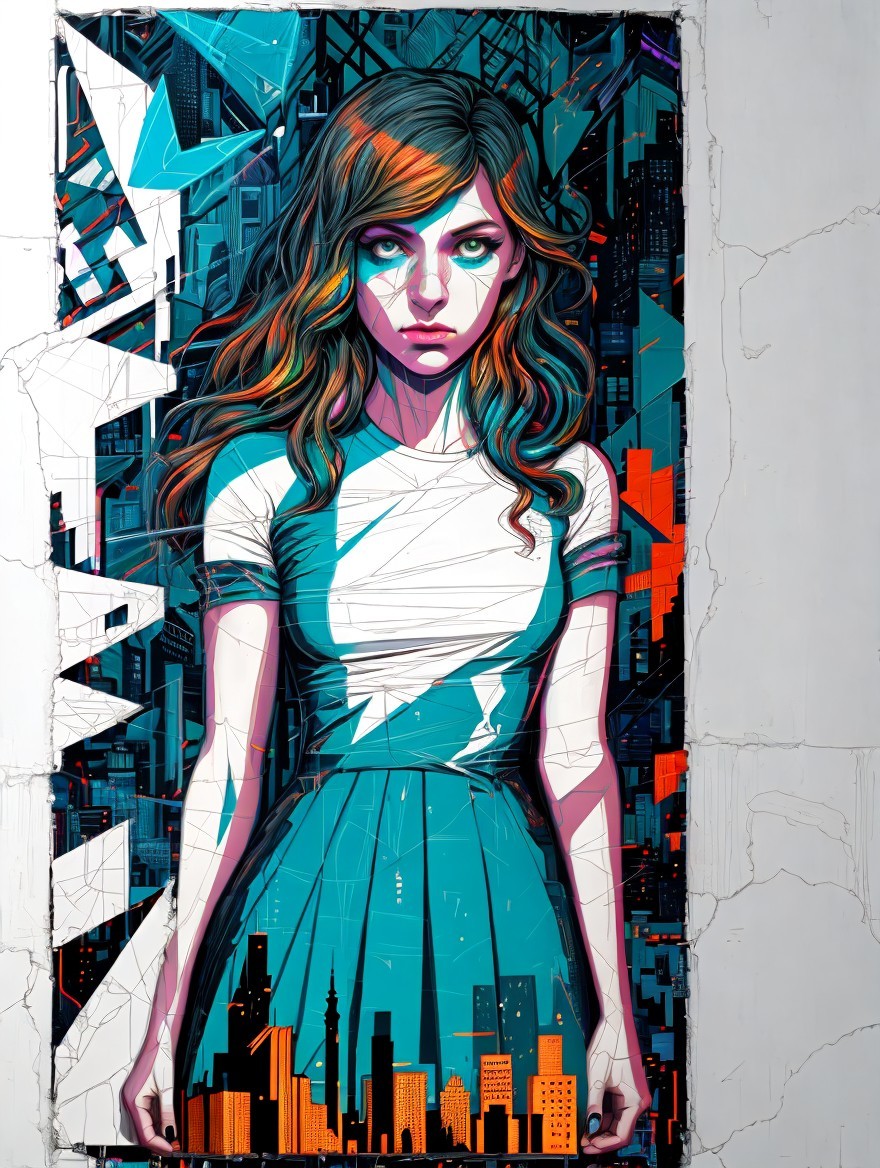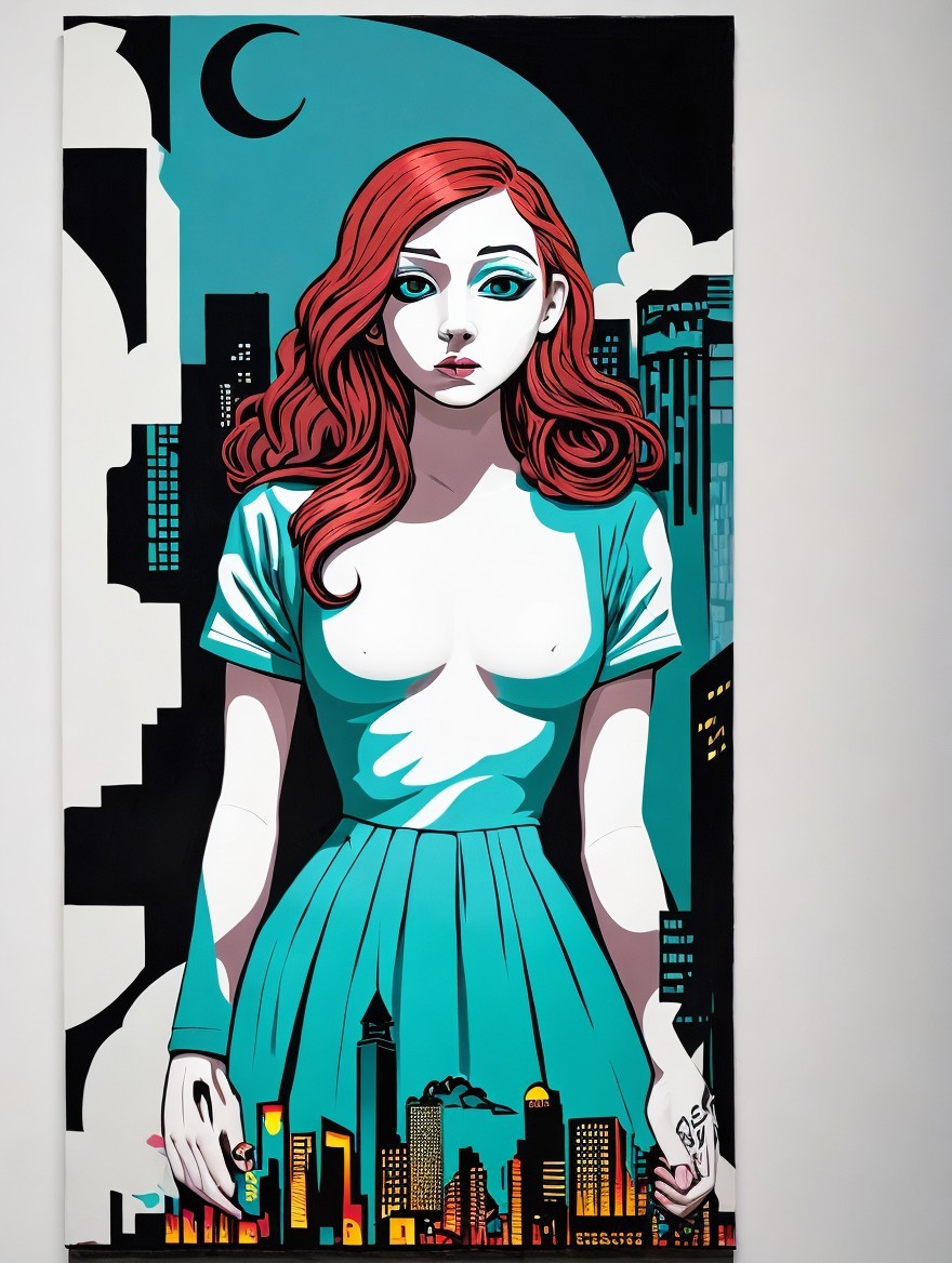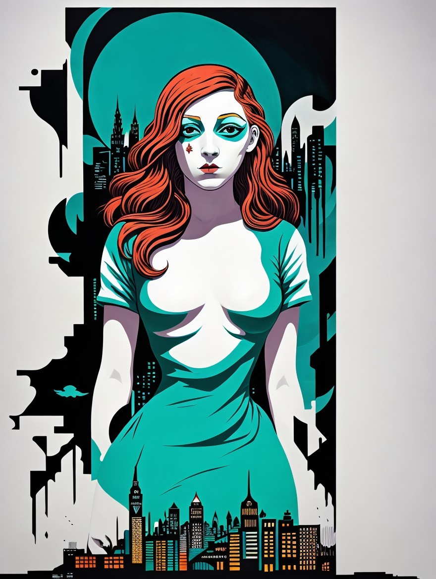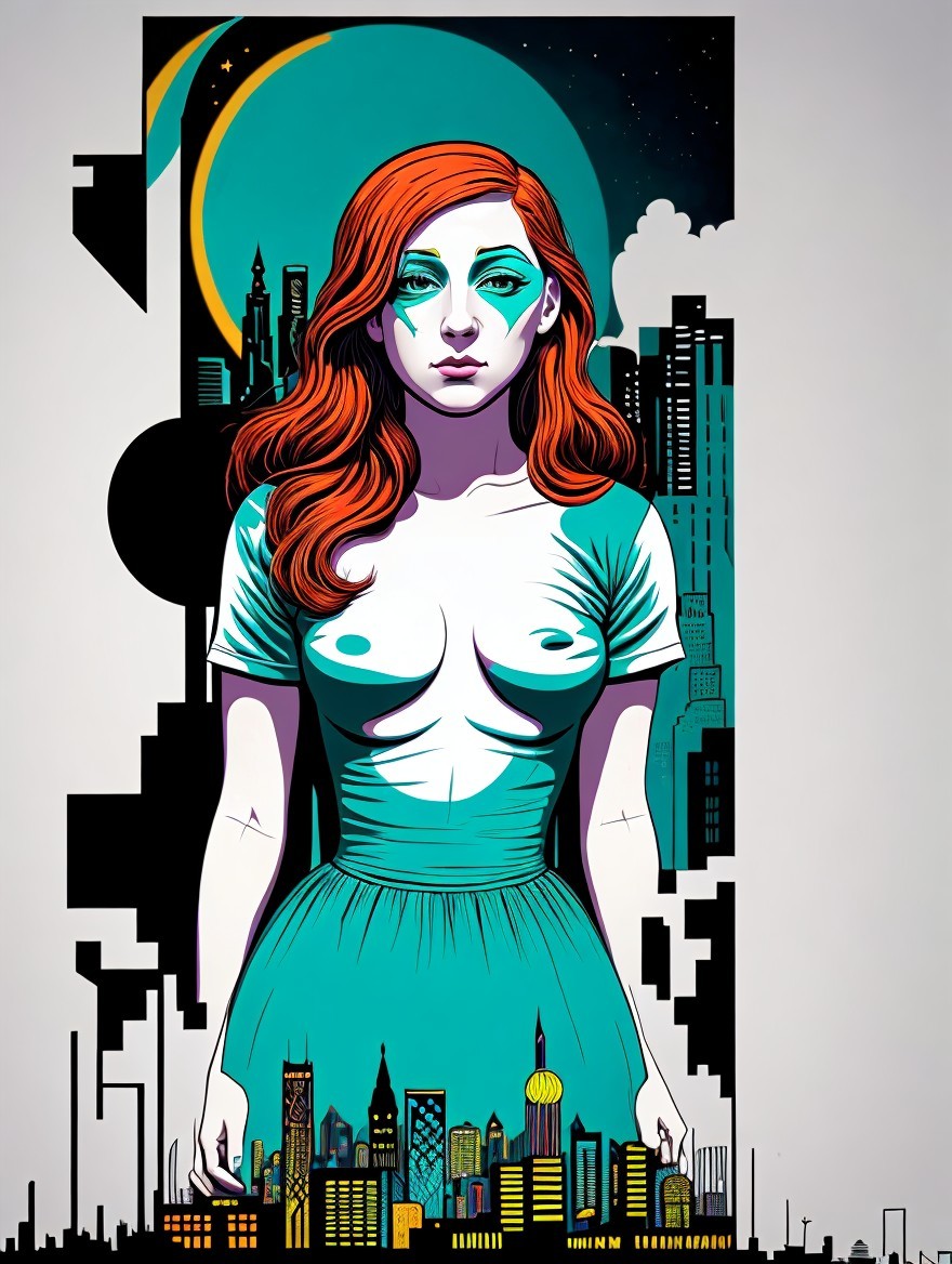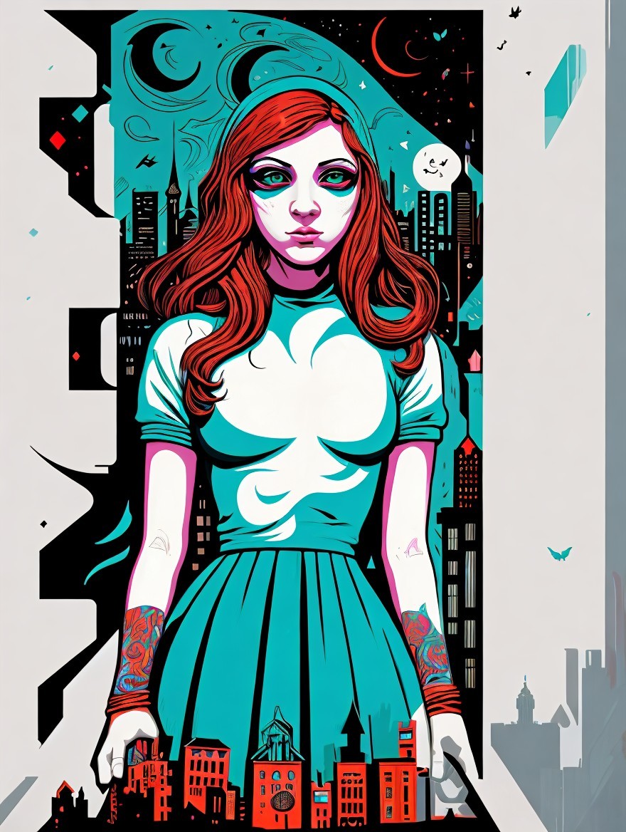 Artistic statement: This piece balances Dan Mumford’s pop-graphic density with symbolic surrealism inspired by late Picasso. It softens hard linework with organic flow and introduces subconscious motifs in the background—fish, abstract signals, dreamlike curvature—without slipping into full abstraction. The girl is no longer just afraid, but entwined with the psyche of the city around her.
