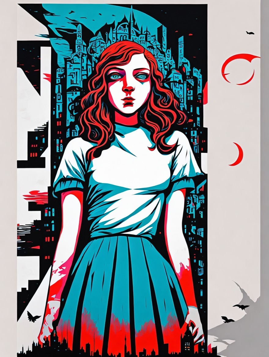 A girl stands against a hallucinatory urban sprawl, her expression solemn and enigmatic. Her hair curls like smoke, her eyes wide with quiet dread. Surreal shapes—a fish, strange patterns, and aerial forms—float in the fractured sky behind her, merging memory and architecture.