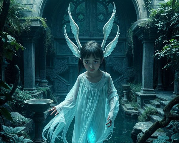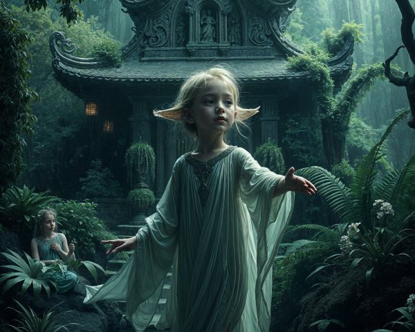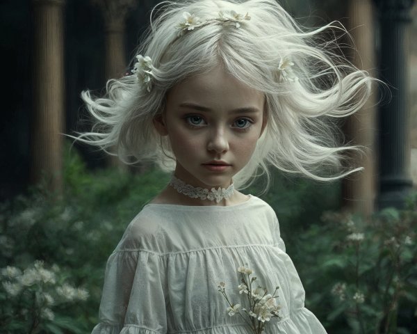 A young girl with flowing silver hair stands amidst lush greenery, wearing a delicate white dress adorned with flowers. She gazes intently, capturing a sense of ethereal beauty and mystery.