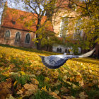A majestic pigeon takes flight against a backdrop of a grand, ornate castle surrounded by vibrant autumn leaves, capturing the beauty of a serene fall day.