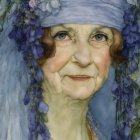 A graceful elderly woman smiles warmly, wearing a lavender hat adorned with flowers. She holds a bouquet and is dressed in elegant, vintage attire, exuding charm and kindness.