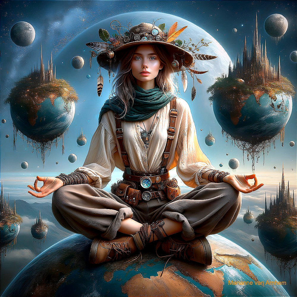 A woman in a steampunk outfit meditates, floating amid fantastical floating islands and multiple moons in a dreamy sky.