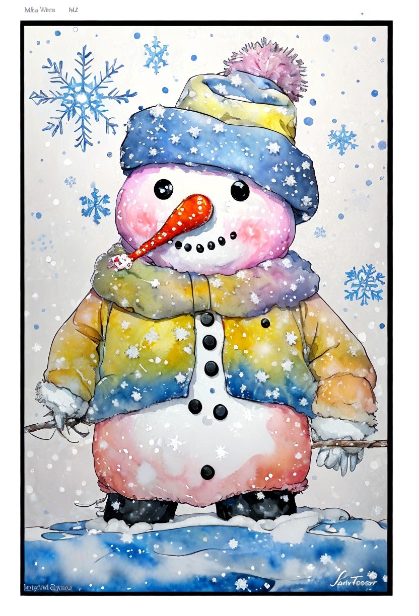 A cheerful snowman stands in a snowy landscape, adorned with a colorful scarf and hat. Snowflakes gently fall around him, adding to the whimsical winter scene.