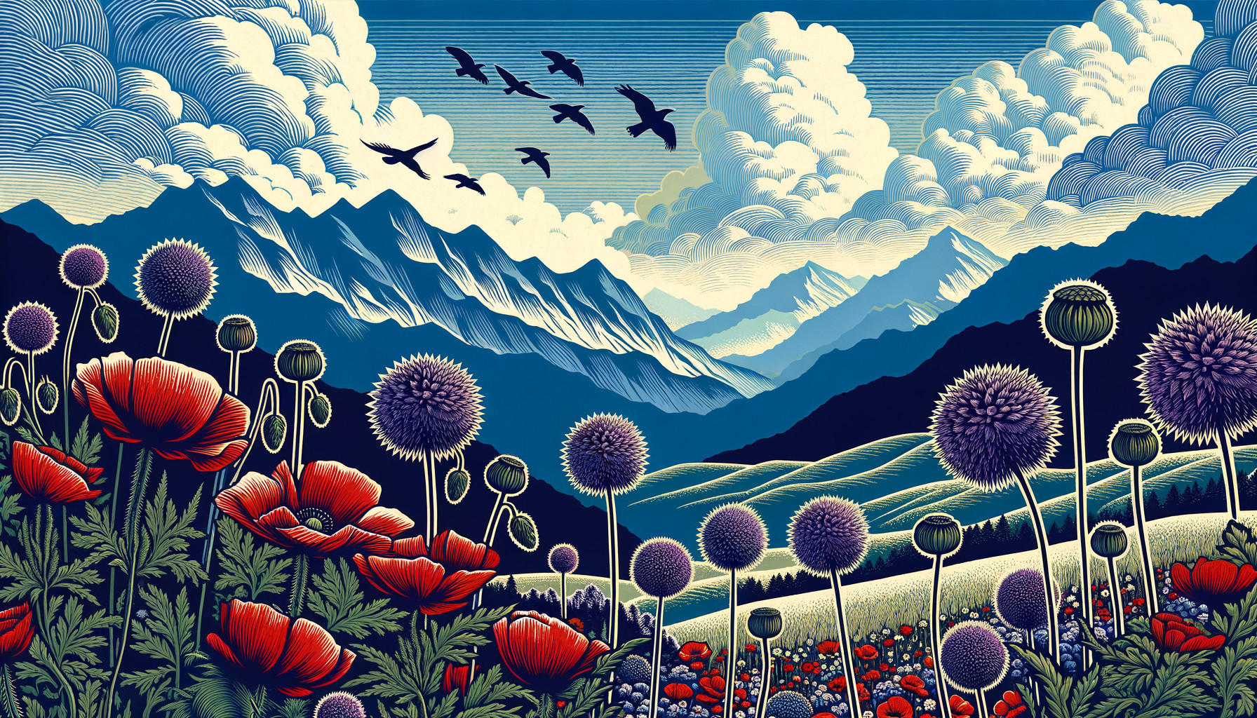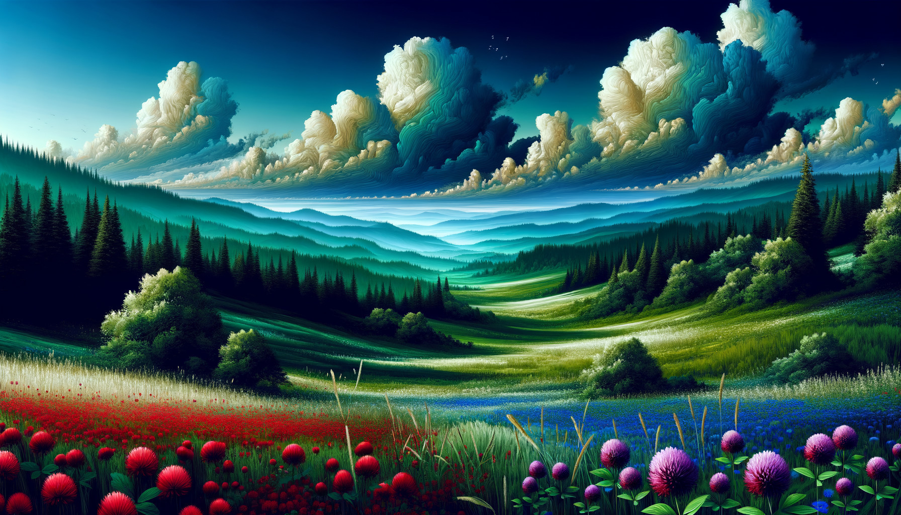 A vibrant, stylized landscape featuring lush hills, colorful flowers in the foreground, and a dynamic sky with birds flying.