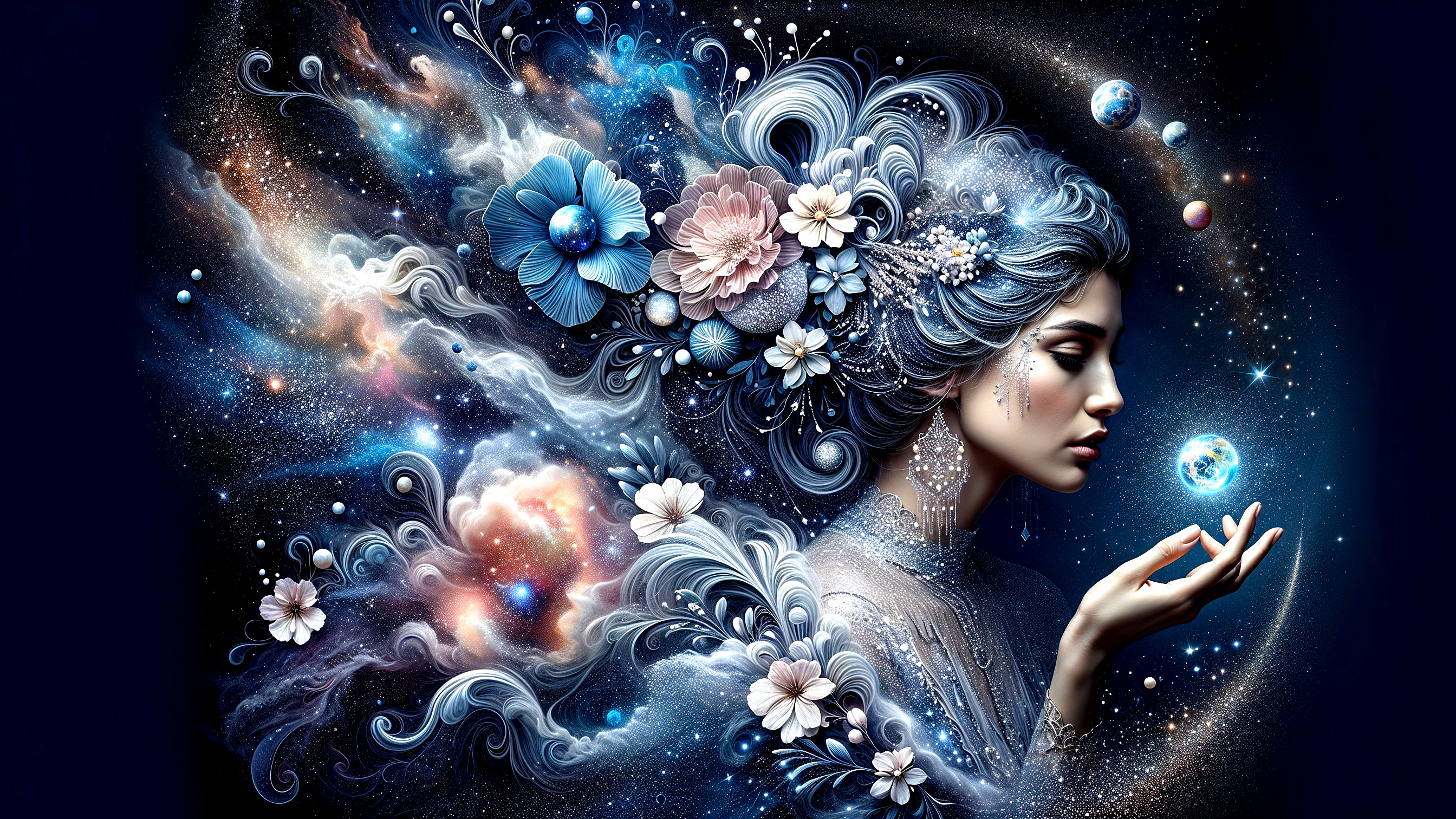 Description: A mesmerizing painting depicts a woman draped in mist against a cosmic floral backdrop. Her nebula-like hair and shimmering teardrop evoke a dreamlike, mystical atmosphere filled with swirling galaxies.