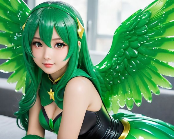 A vibrant anime character in a stylish strapless swimsuit stands confidently in a dimly lit parking garage, showcasing a blend of urban aesthetics and playful summer vibes.