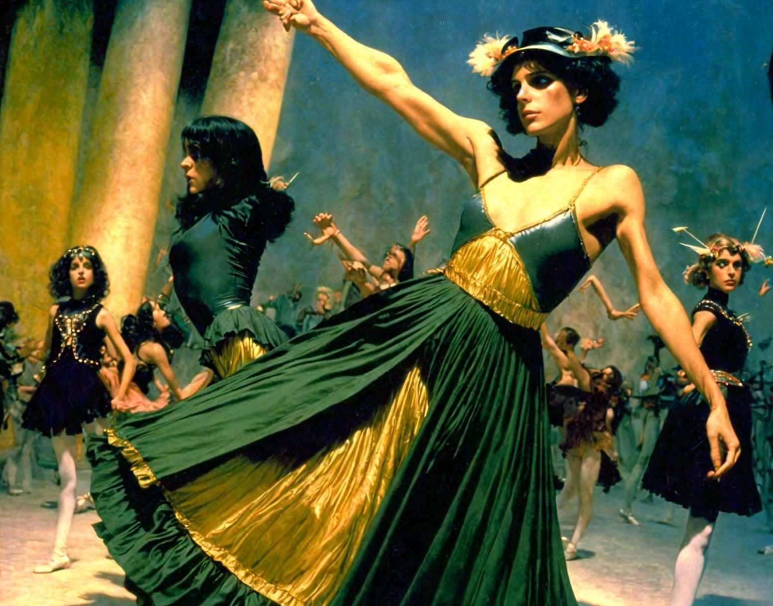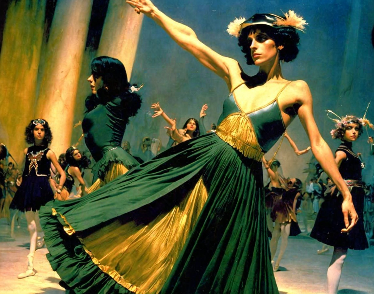 A painting depicting dancers in black and gold costumes performing, with one prominently in the foreground.