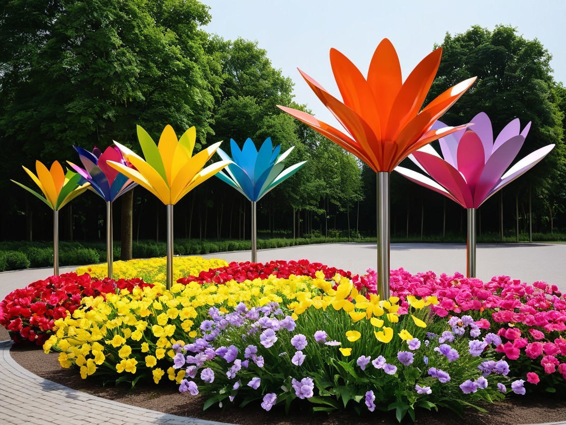 A vibrant garden scene features colorful, large flower sculptures standing amidst blooming beds of bright flowers. Lush greenery surrounds the area, creating a cheerful and inviting atmosphere.