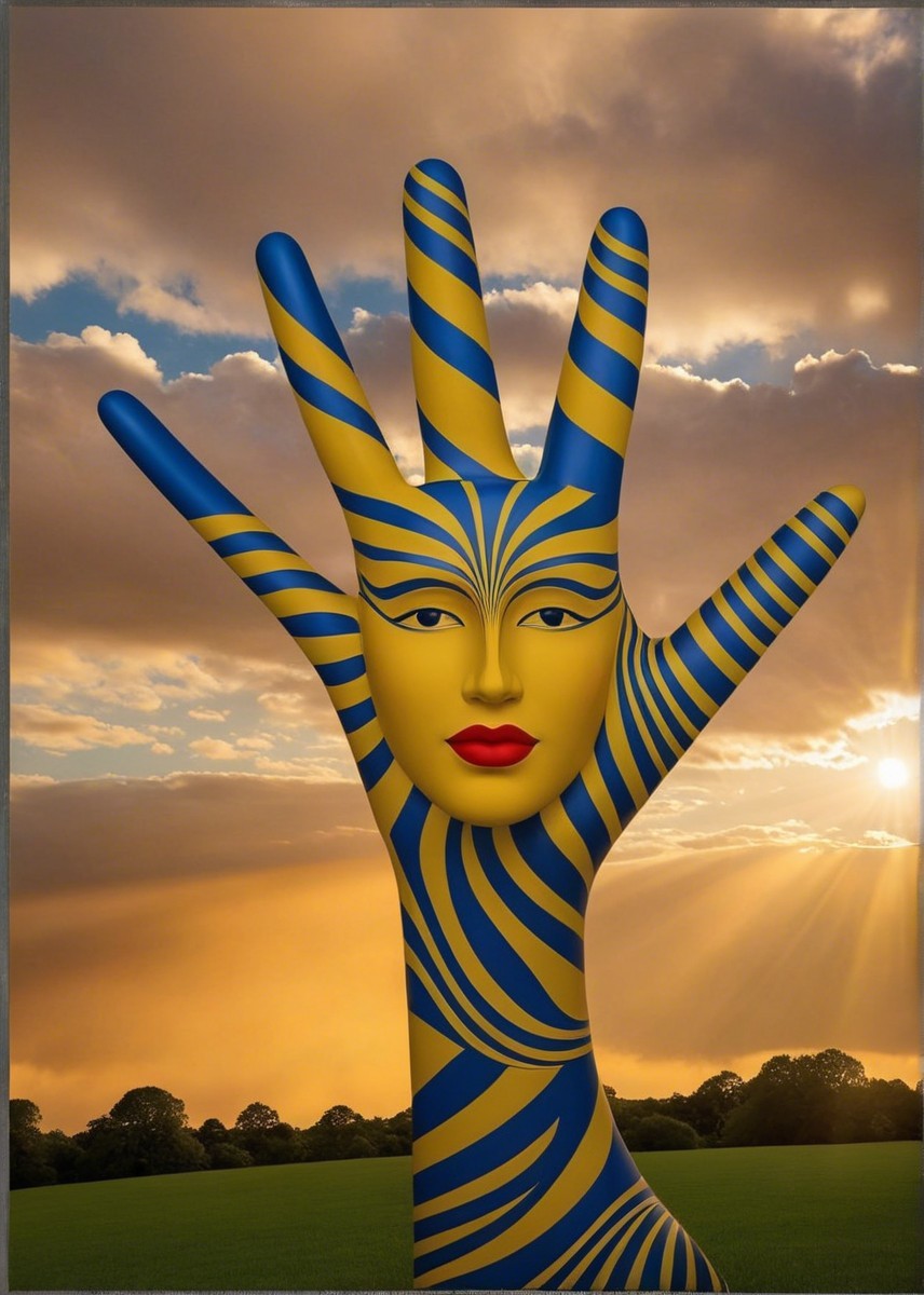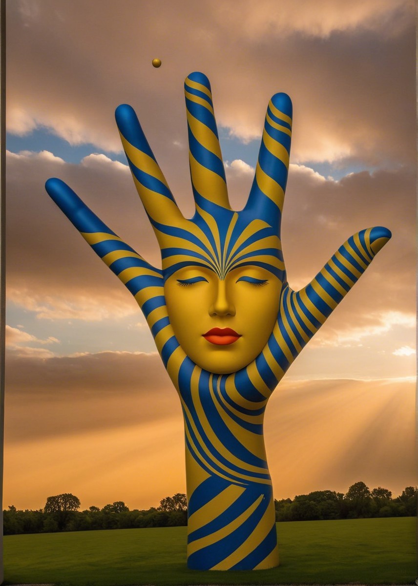 A large, vibrant blue and yellow hand sculpture rises from a grassy field, featuring a serene face and closed eyes, set against a dramatic sky with soft clouds and glowing celestial orbs.