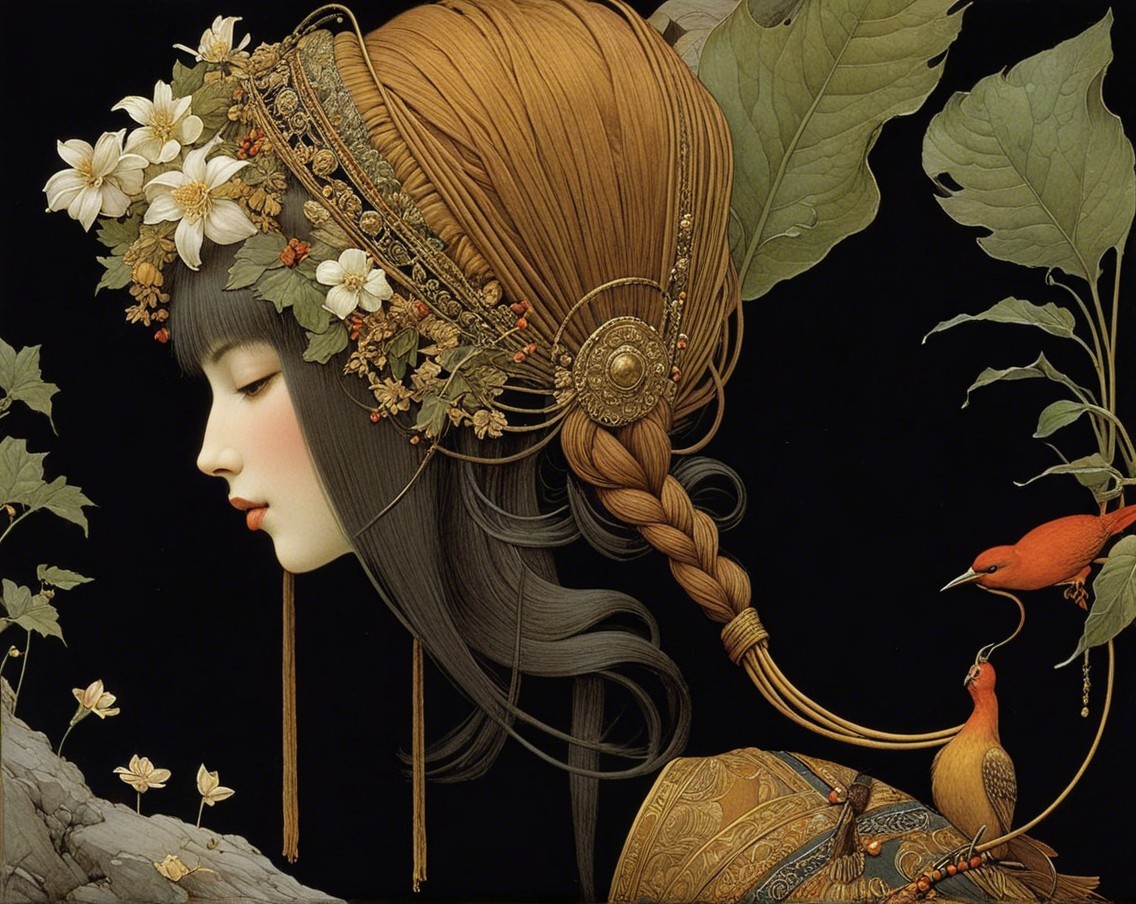 The image features a serene woman in a richly textured orange headdress, focused on a book. She is surrounded by delicate plants, blending elegance with a sense of tranquility.