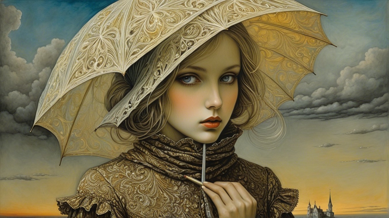 A whimsical fairy with flowing curls sits gracefully on an ornate staircase, surrounded by a dreamy sky, emanating a sense of tranquility and enchantment. Her intricate dress complements her ethereal presence.