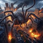 A massive spider wreaks havoc in a burning Paris, towering over iconic landmarks like Notre-Dame and the Louvre. Lightning strikes illuminate the chaos as vehicles flee beneath its shadow.