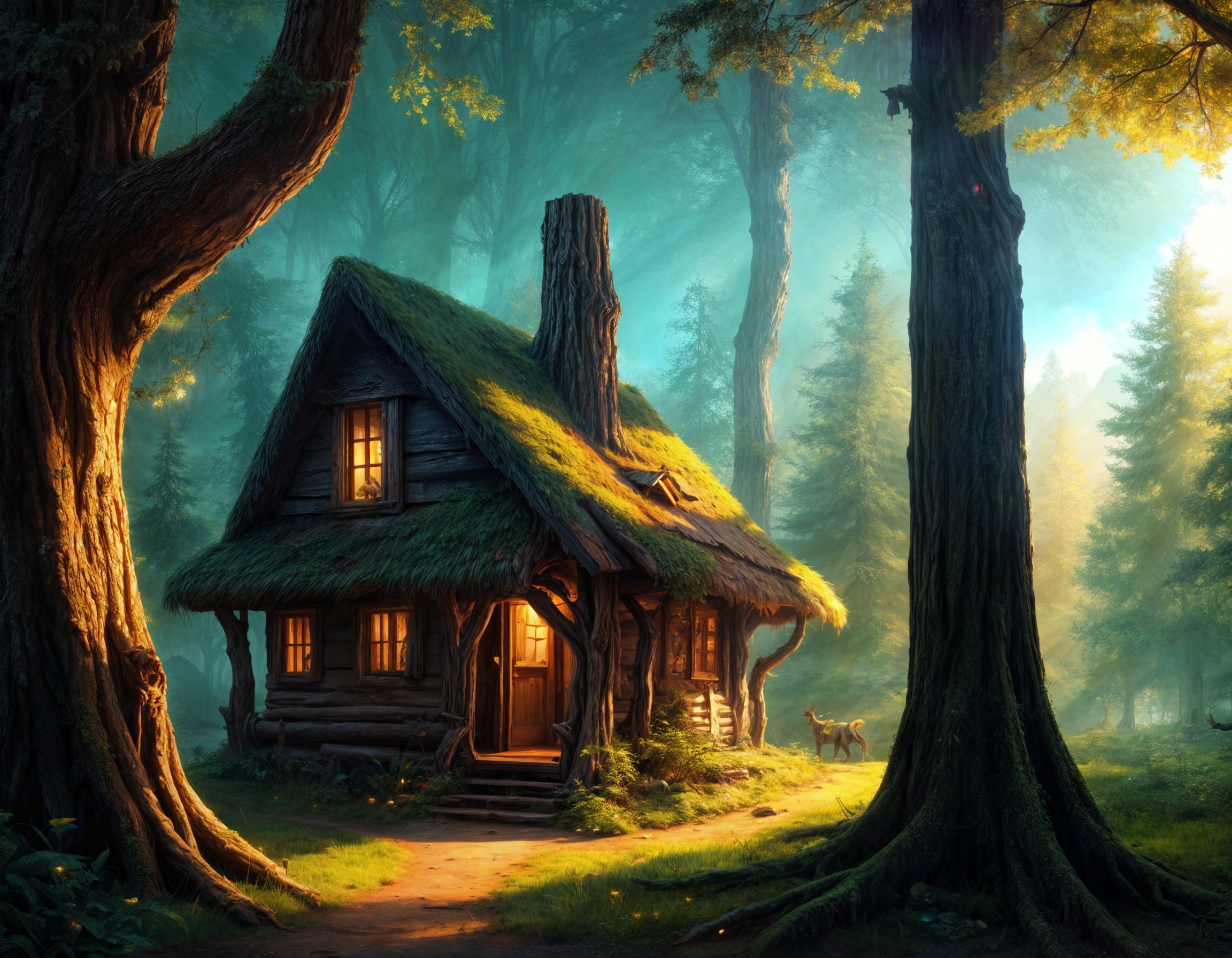 Enchanting forest cottage with mossy trees, golden light, and peaceful deer. A fairy-tale-like serene setting.