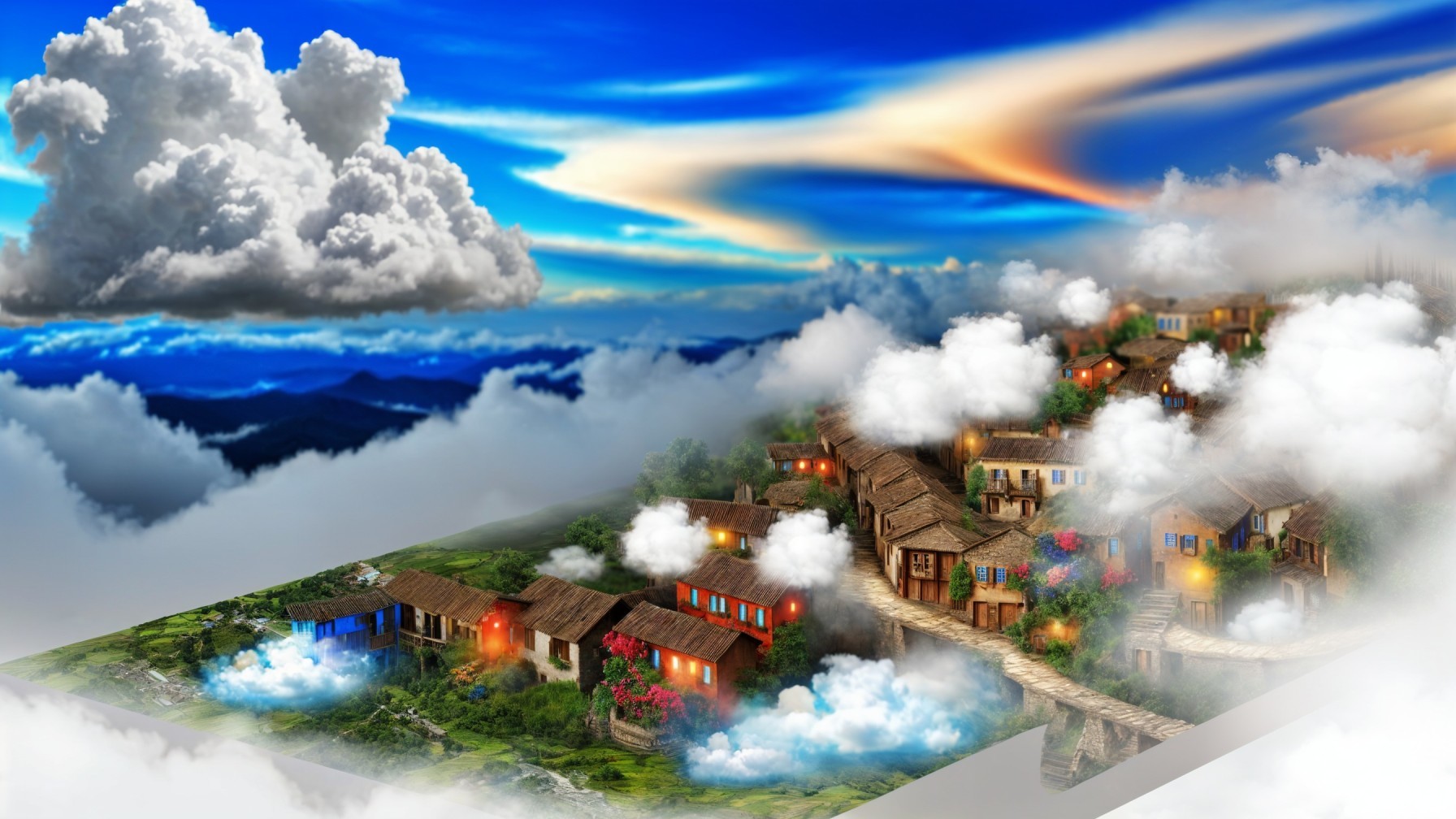 A picturesque village nestled atop a lush green hill, surrounded by billowing clouds and towering mountains, under a vibrant blue sky filled with dramatic, white clouds.