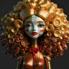 A close-up studio shot of a woman with red lips and closed eyes, her head, shoulders, and bust covered in a large, elaborate floral arrangement. Her skin is pale and flawless, with delicate makeup around her eyes and on her cheeks. The floral arrangement, serving as her hair, is