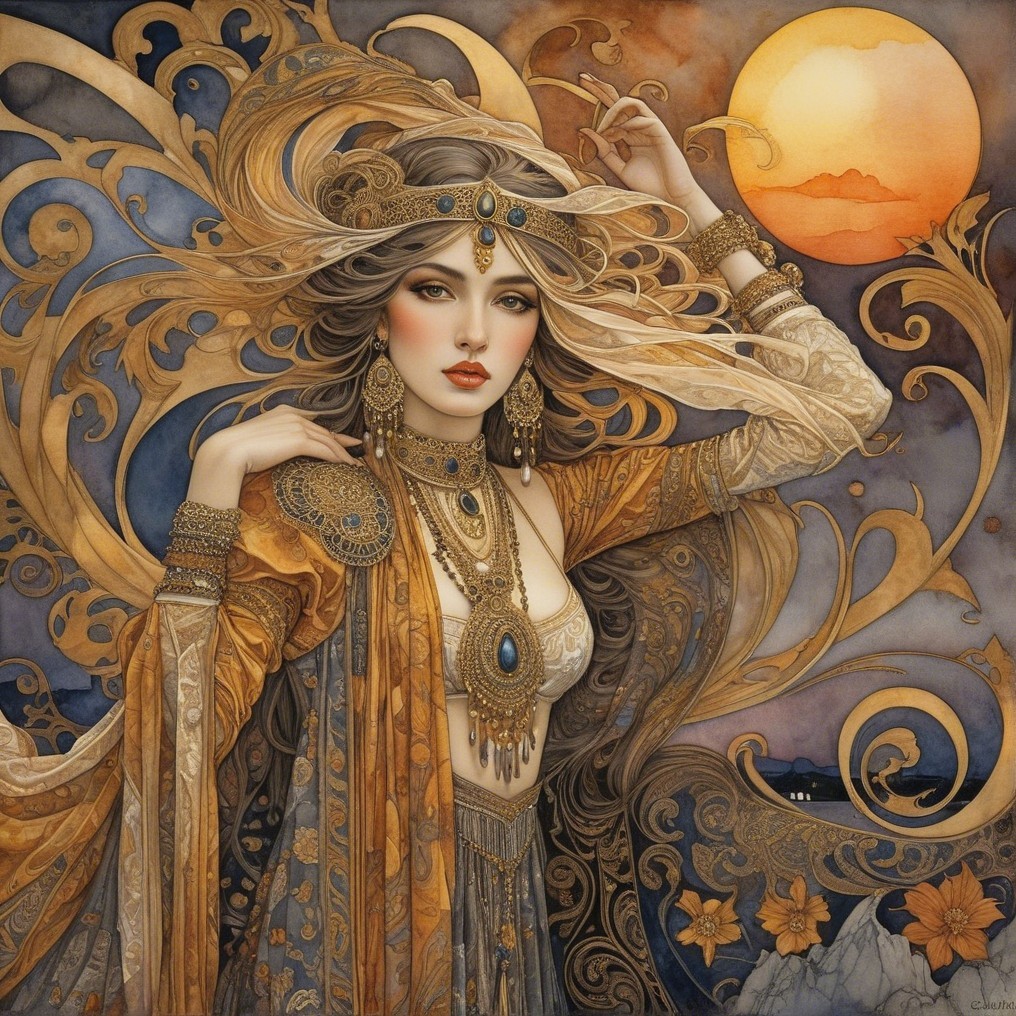 A glamorous woman adorned in rich fabrics and intricate jewelry gazes thoughtfully, framed by flowing hair and a sunset backdrop, evoking a sense of mystery and elegance.