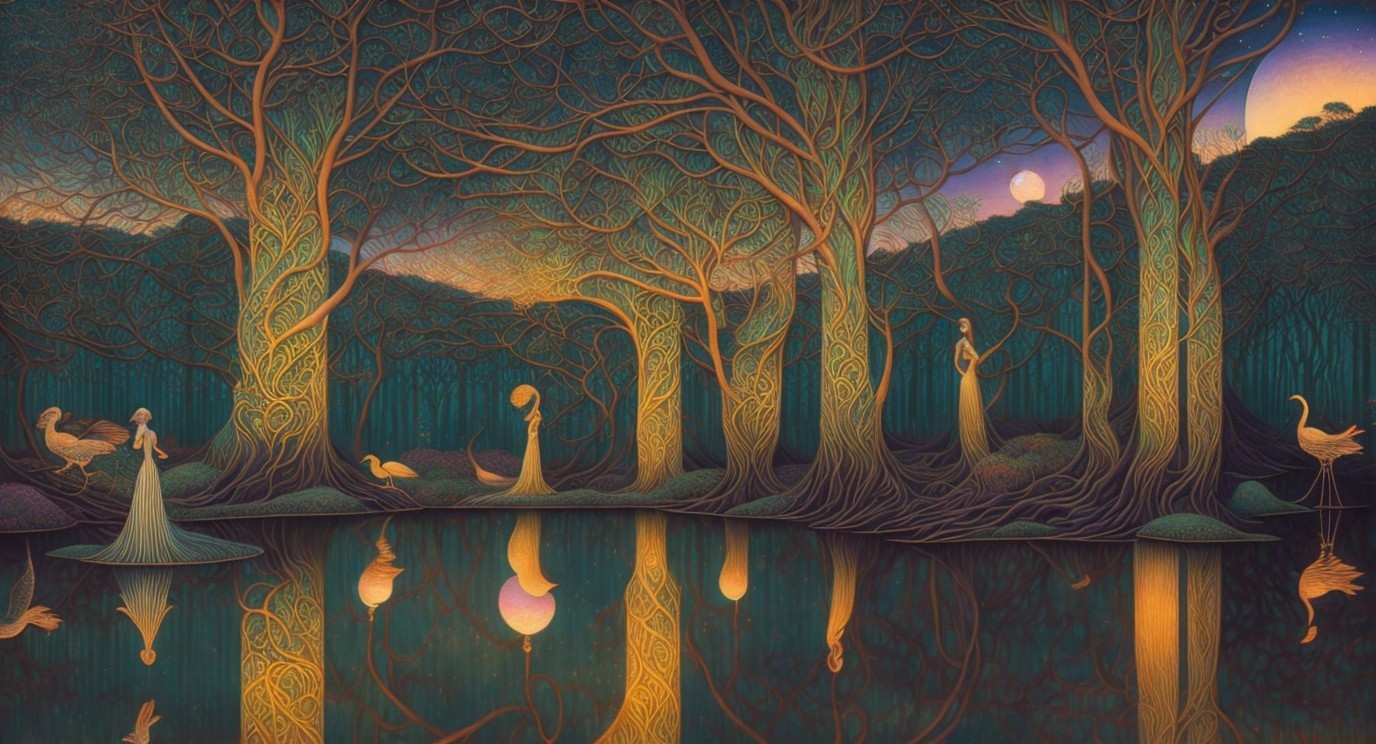 Forest scene with trees, reflective water, elegant peacocks, and ethereal women blending with nature under a dusk sky.