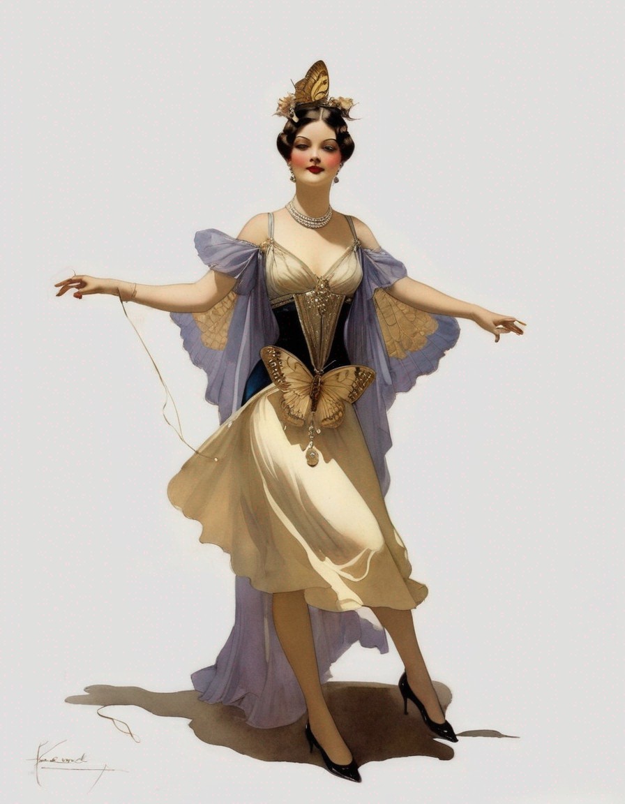 Vintage illustration of a woman dressed in a butterfly costume with wings, holding up a sheer cape, against a plain background.