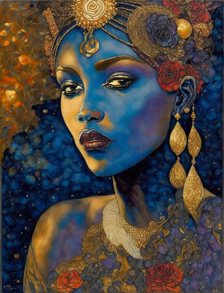 A vibrant portrait of a woman with a head wrap and jewelry, set against a cosmic backdrop with warm tones and celestial elements.