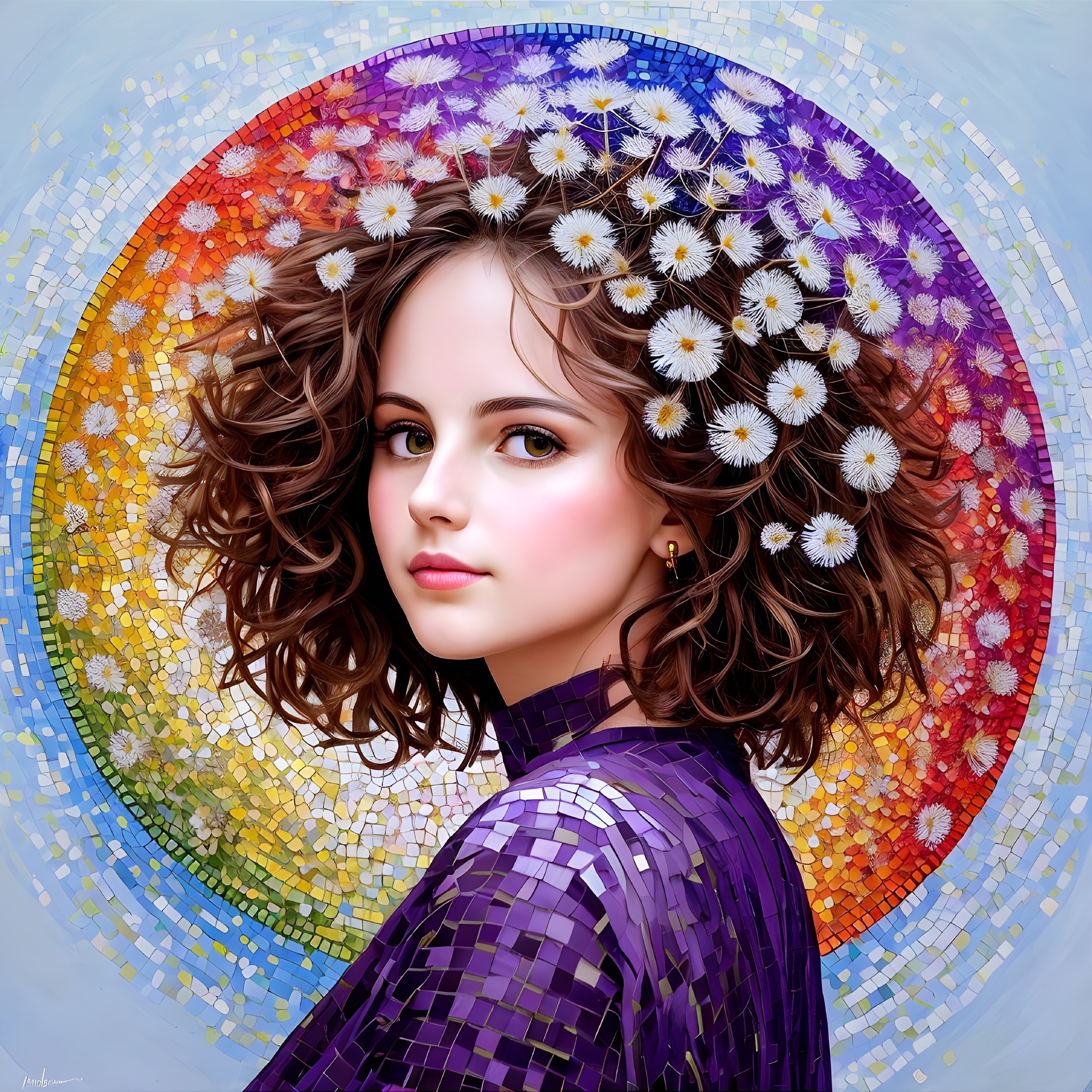 A vibrant and modern artwork featuring a dandelion created with a mosaic of colorful circles on a square canvas. The piece showcases intricate details of facial features within the circular pattern, set against a textured background of similarly styled dots. The use of primary colors and additional shades creates depth and contouring, offering a beautiful and dynamic visual experience.