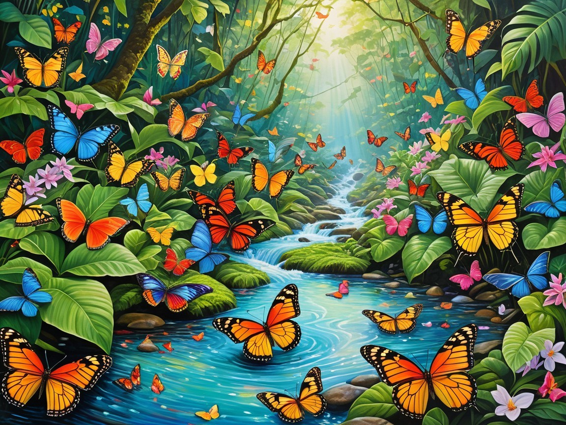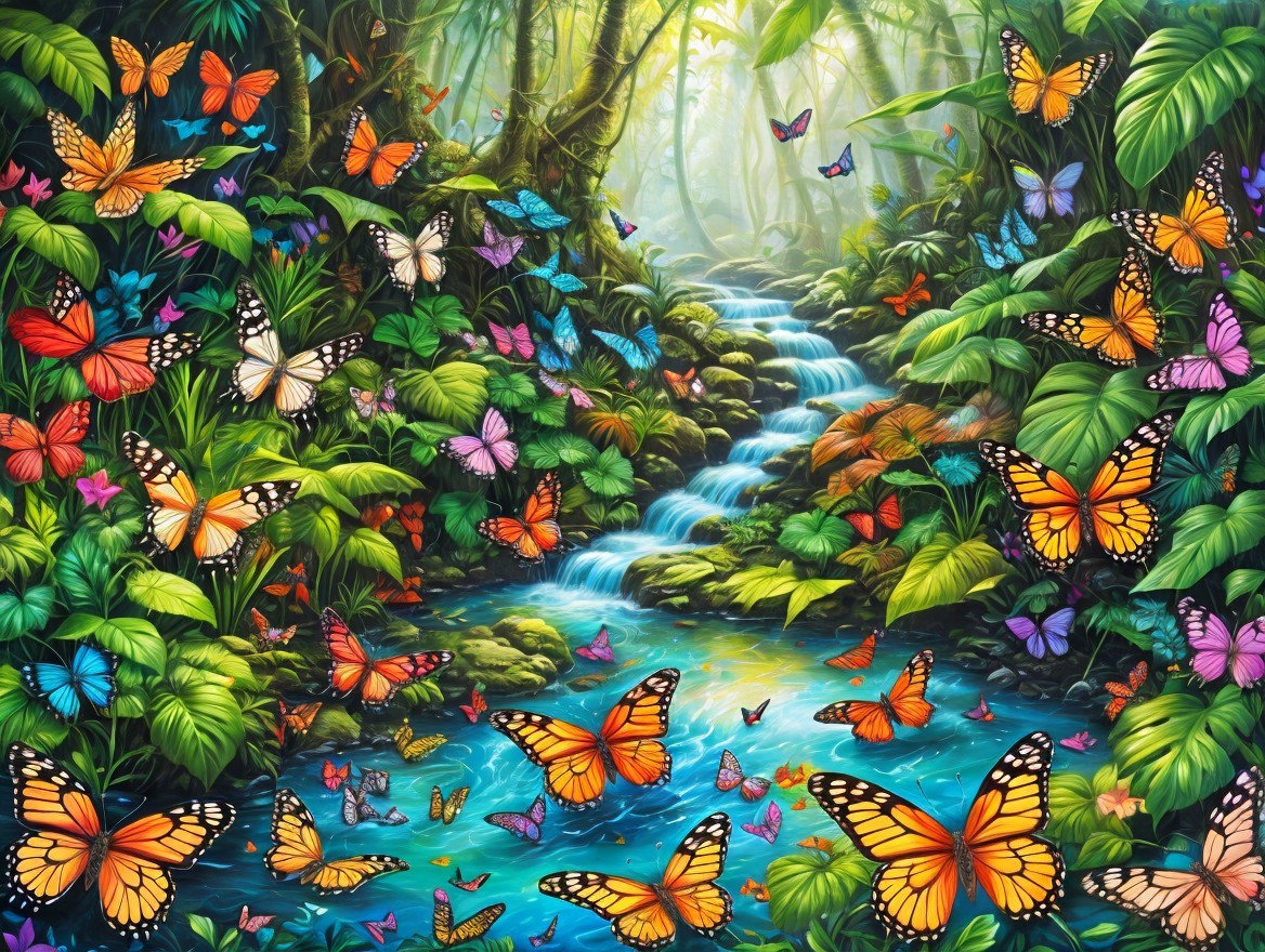 A vibrant jungle scene is filled with lush greenery and colorful flowers. Monarch butterflies flutter around a winding stream, creating a serene and enchanting atmosphere brimming with life.