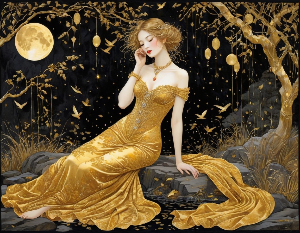 A woman in a golden dress sits elegantly under a tree with golden leaves and birds, with a full moon in the background.