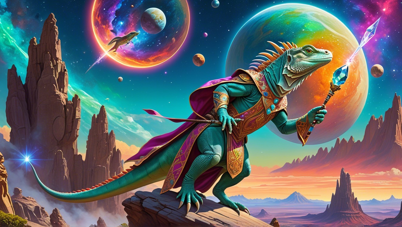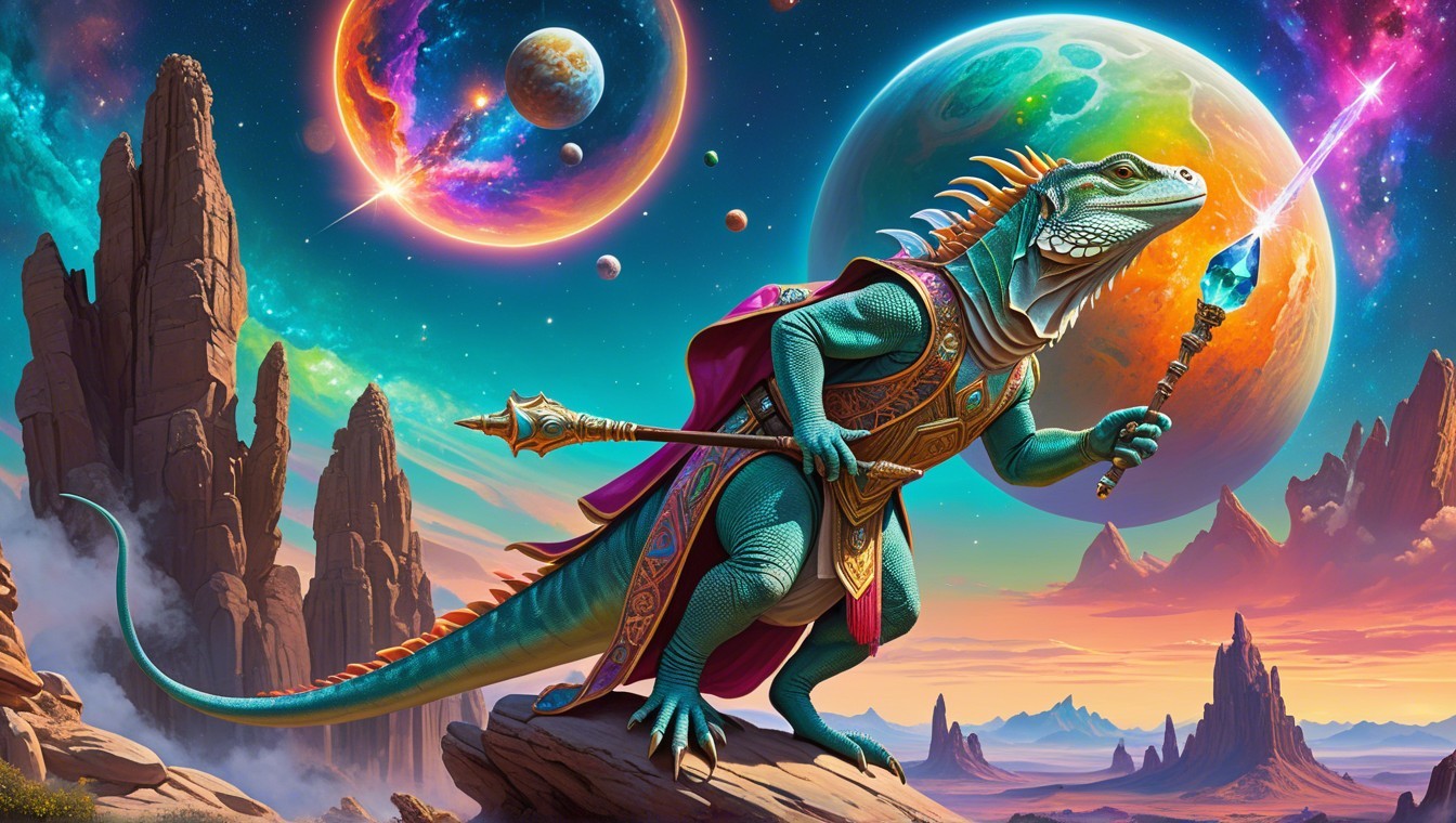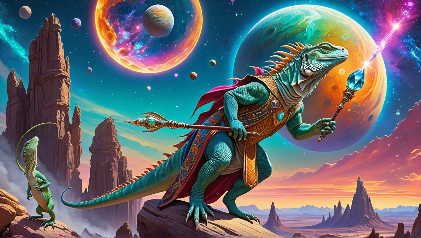 A regal lizard stands proudly on a rocky landscape, adorned in vibrant robes and holding a shimmering crystal staff. In the background, colorful planets and celestial bodies create a cosmic scene.